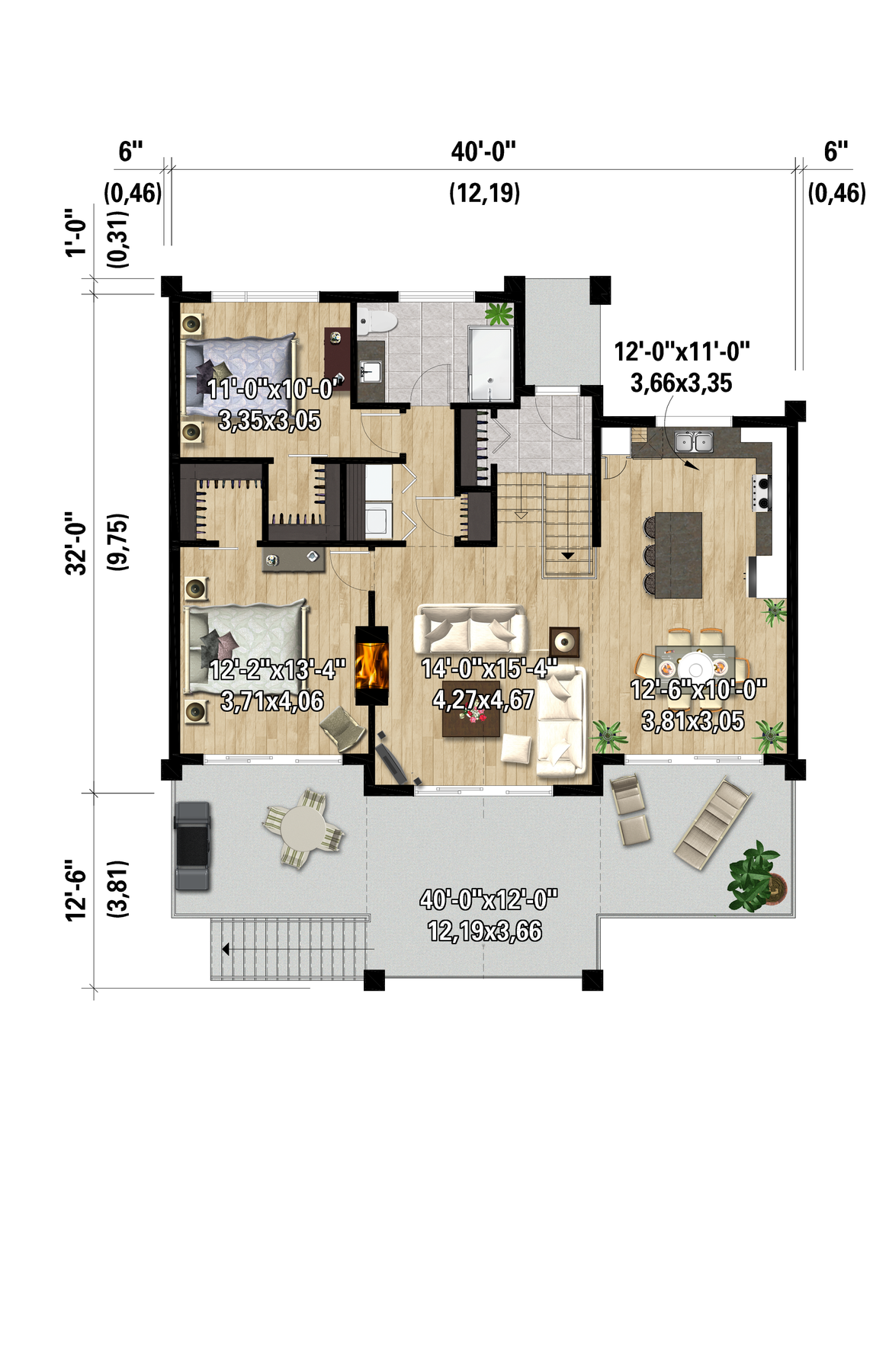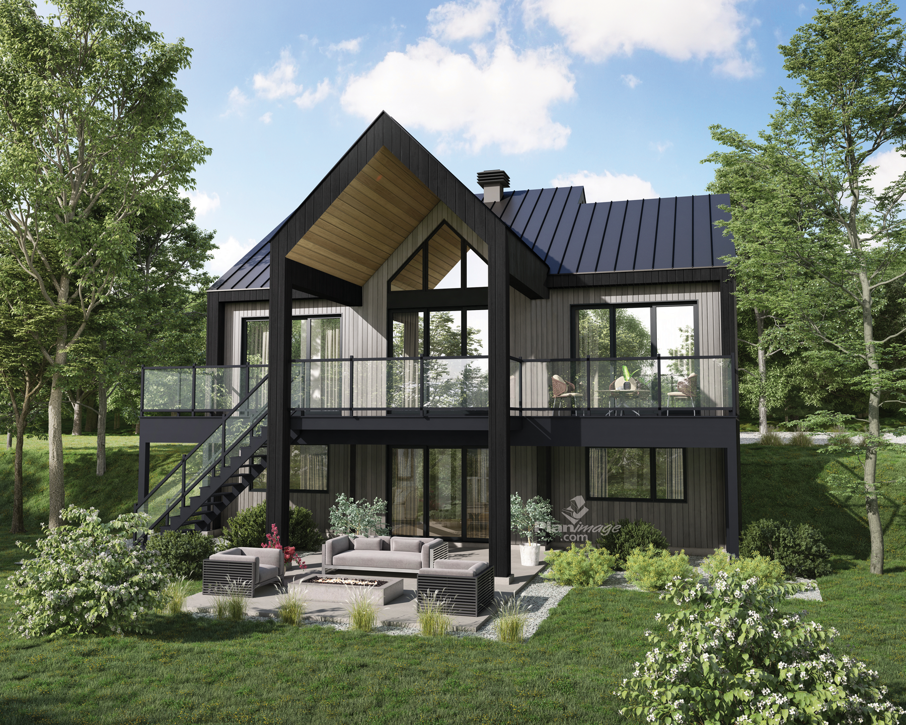 Ce chalet de style urbain à la fenestration abondante fait 40 pieds de largeur sur 30 pieds de profondeur, sa superficie habitable est de 1 100 pieds carrés.