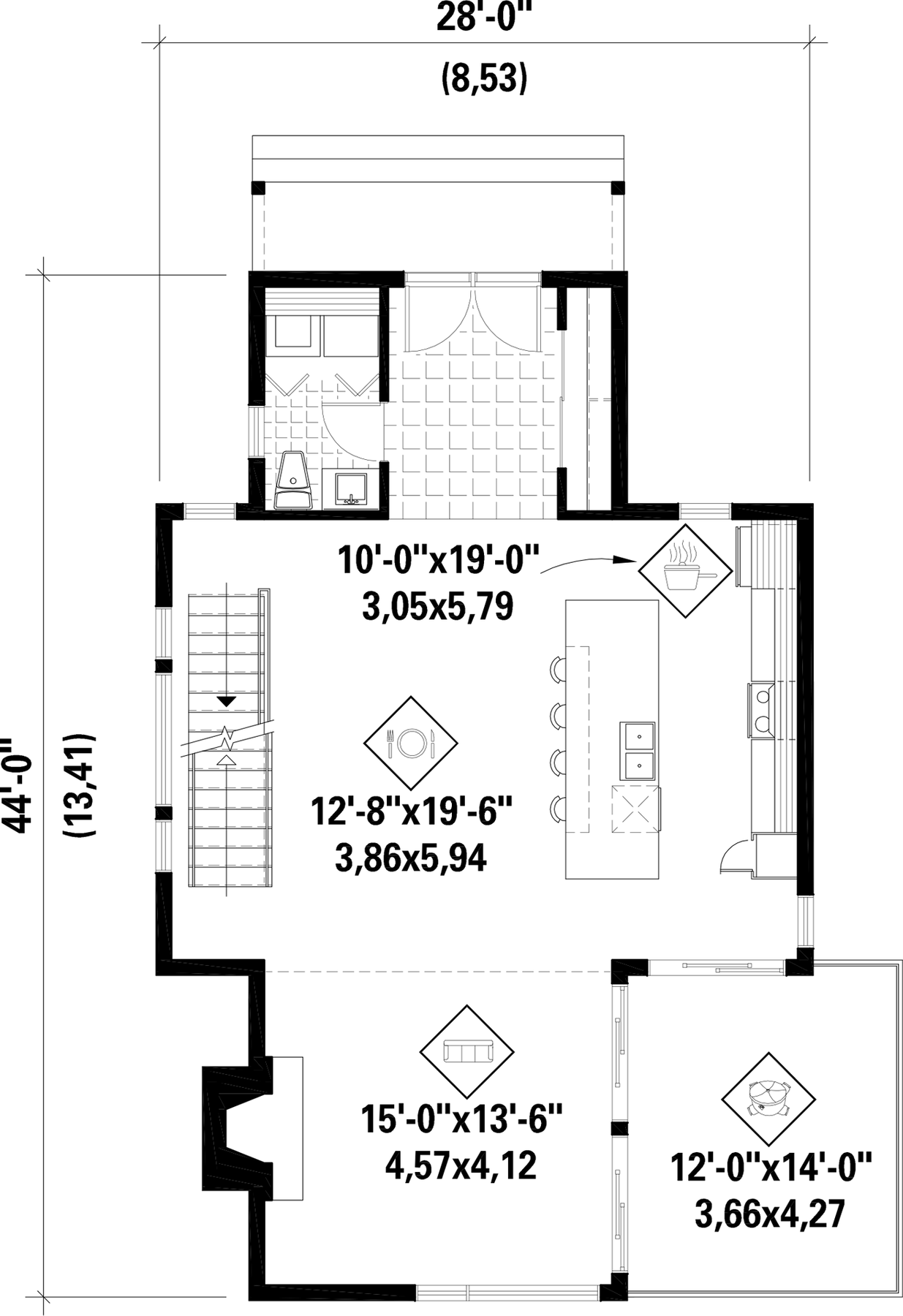 D’une superficie de 944 pieds carrés, le rez-de-chaussée à aire ouverte comprend une grande entrée avec une penderie mur à mur, un escalier positionné devant les fenêtres, un salon avec un plafond cathédrale où vous pourrez vous détendre devant un foyer, une cuisine avec un îlot, une salle à manger et une salle d’eau avec un espace pour la laveuse et la sécheuse.