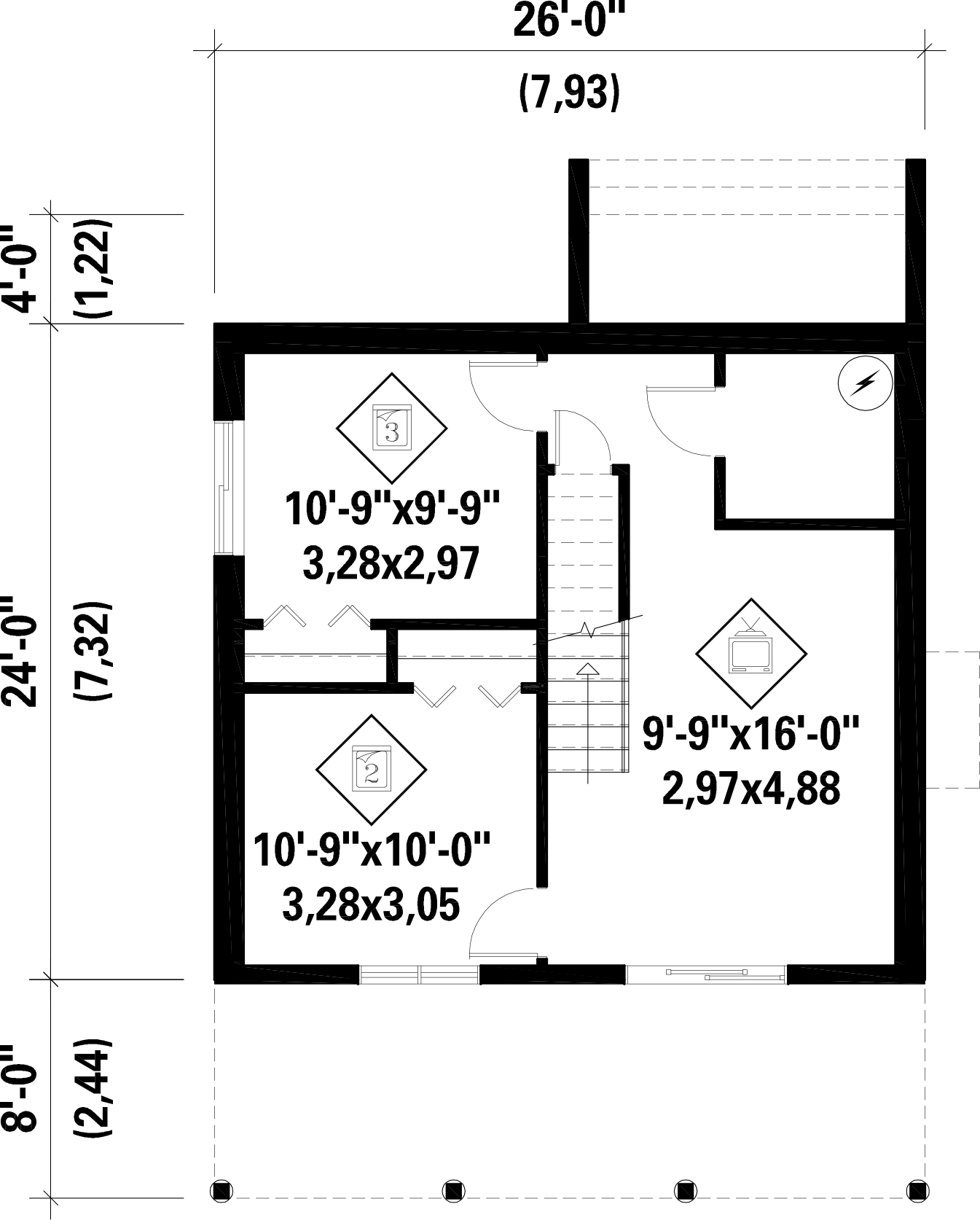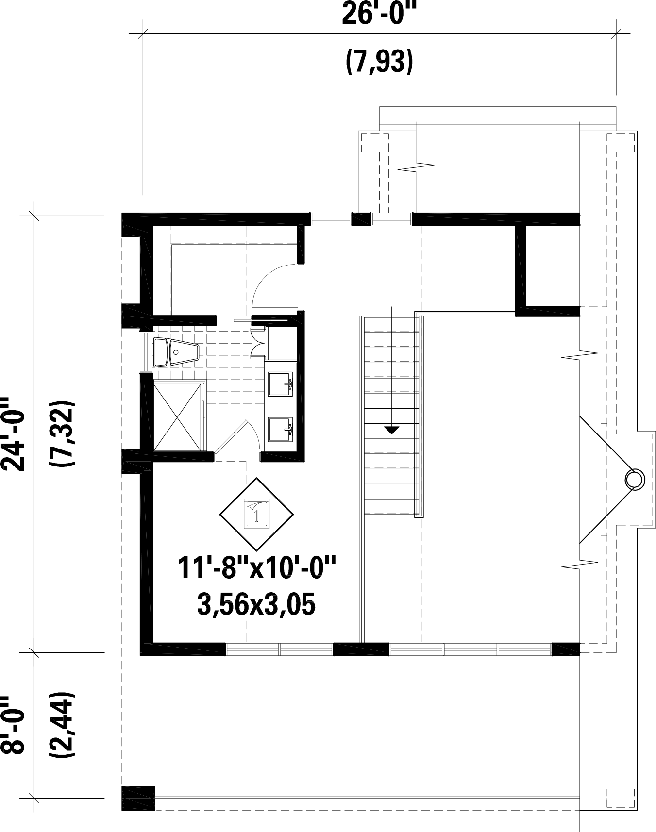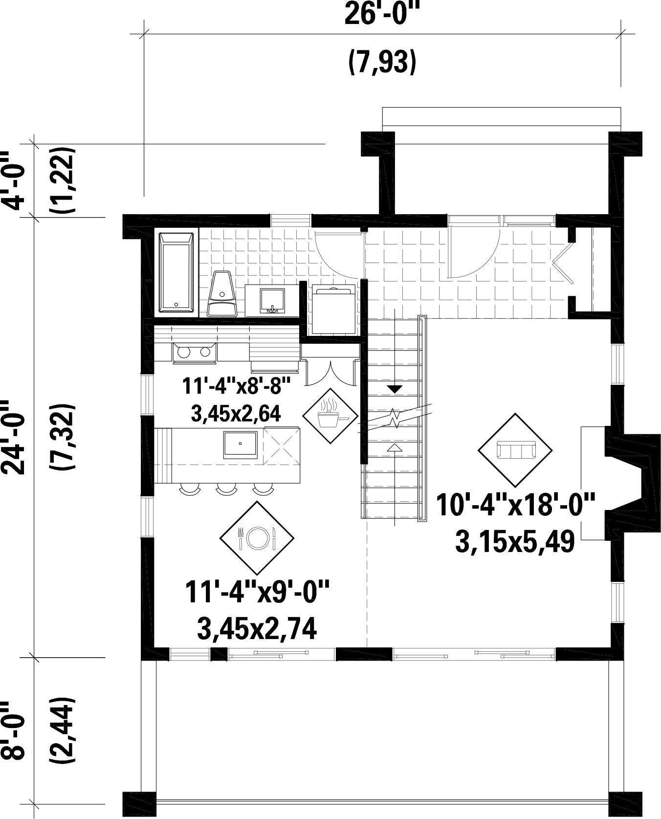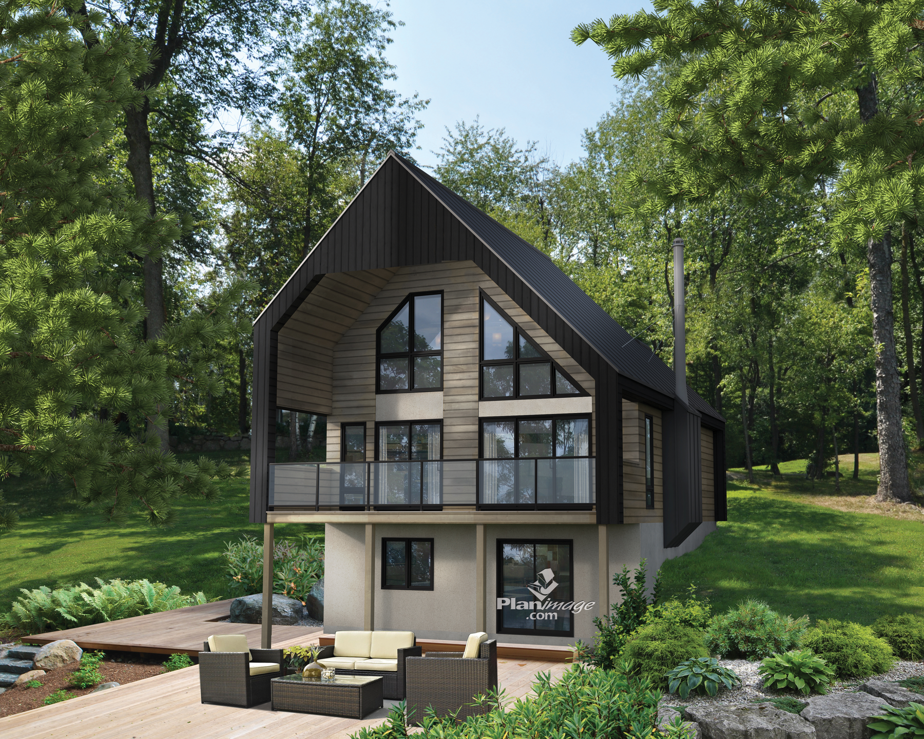 Coiffé d’un toit en pignon, ce chalet de style scandinave possède un balcon couvert ainsi qu’une abondante fenestration. Il fait 26 pieds de largeur sur 24 pieds de profondeur, et offre une surface habitable de 1 457 pieds carrés. Le sous-sol de 492 pieds carrés comprend une salle familiale, une pièce de rangement, ainsi deux chambres à coucher. Le rez-de-chaussée de 624 pieds carrés comprend un salon avec foyer et plafond cathédral, une salle à manger, une cuisine laboratoire avec ilot et une salle de bains complète avec un espace pour la buanderie. Suite des maîtres sur la mezzanine à l’étage avec une salle de bains et une vaste penderie, elle est ouverte sur le salon et couvre une surface de 341 pieds carrés.