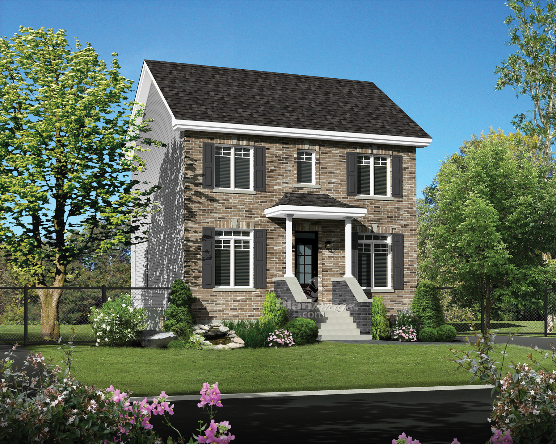 Cette maison à étage affiche résolument son style colonial, avec son revêtement de briques, ses nombreuses fenêtres agrémentées de volets, et son porche central encadré de colonnes. Elle mesure 28 pieds de largeur sur 30 pieds de profondeur, et dispose d’une surface habitable de 1 597 pieds carrés.