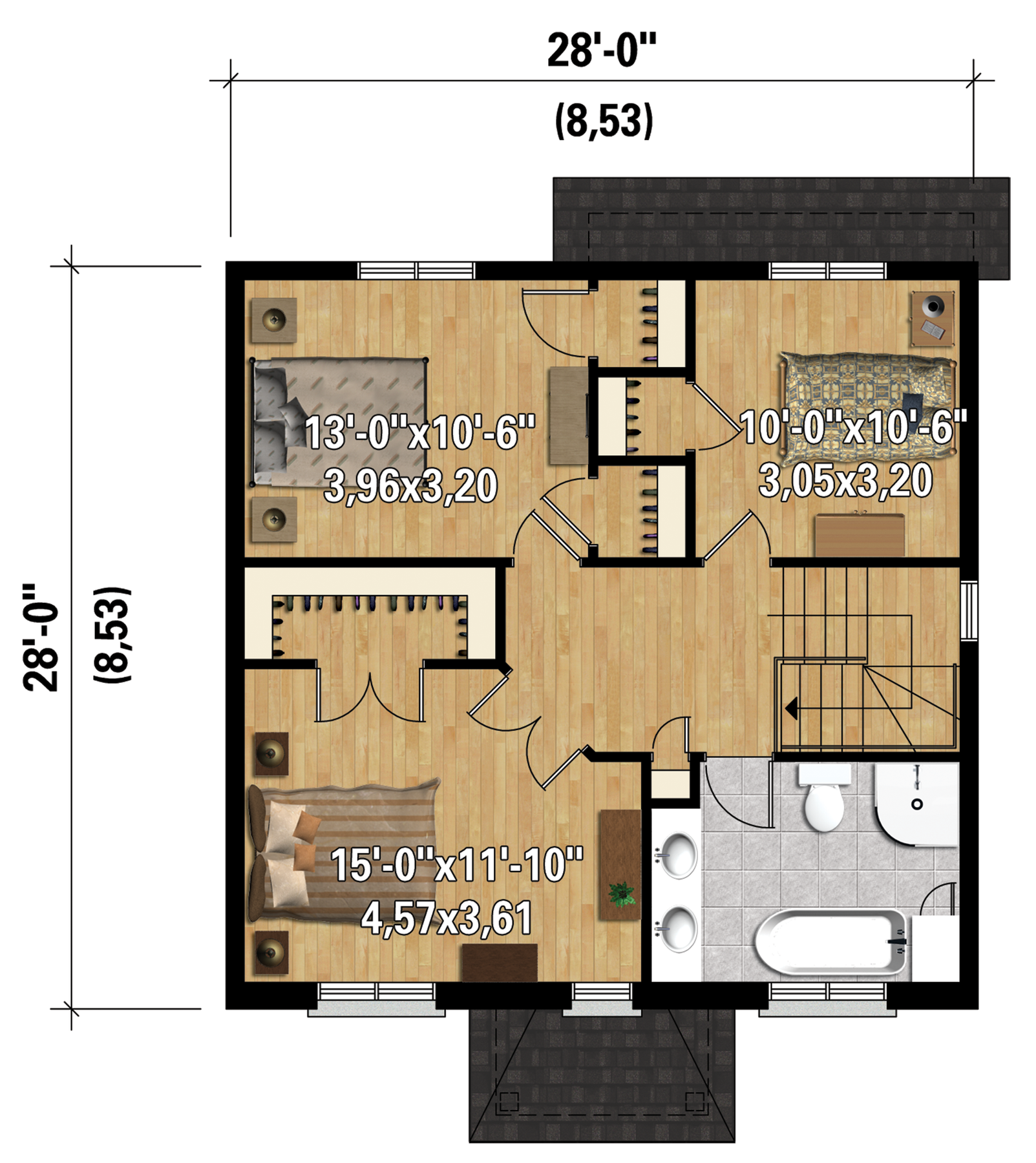 L'étage, dont la surface habitable s'élève à 784 pieds carrés, comprend une chambre des maîtres avec penderie, deux chambres secondaires et une salle de bains avec baignoire sur pieds et douche en coin, ainsi qu’un meuble-lavabo avec deux vasques.