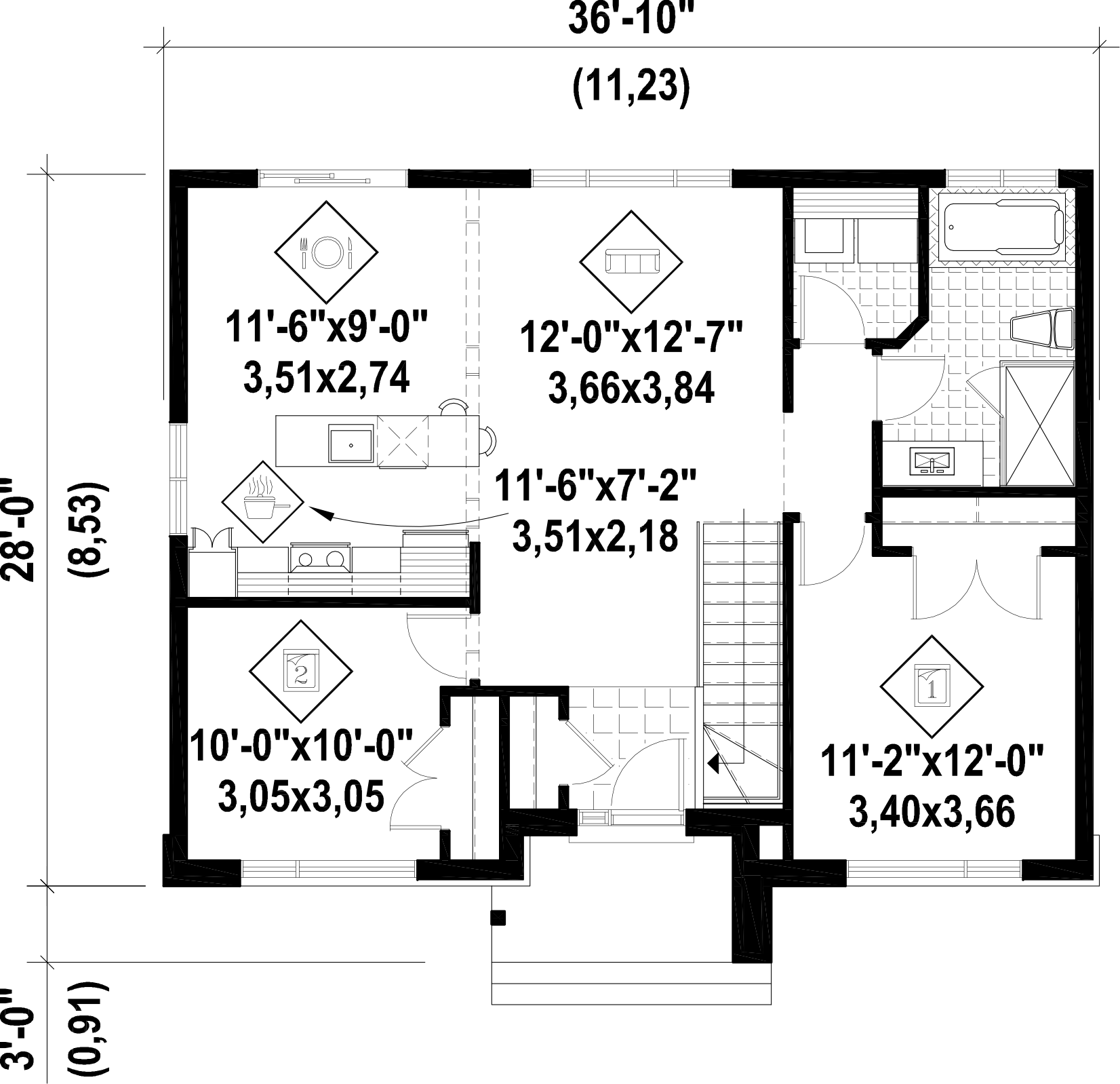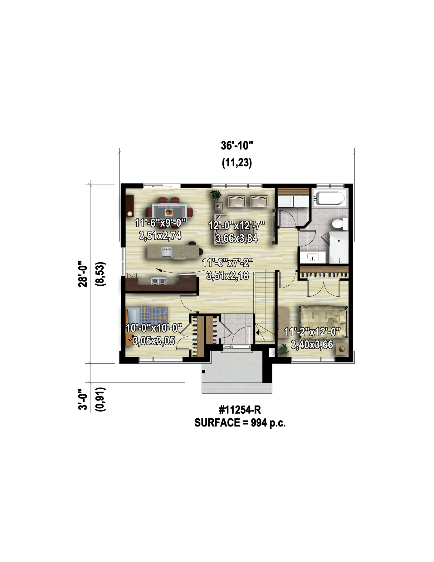 Cette ravissante maison de plain-pied affiche deux styles de toitures – le toit plat et la toiture à un versant. Elle mesure 36 pieds 10 pouces de largeur sur 28 pieds de profondeur et offre une surface habitable de 994 pieds carrés.