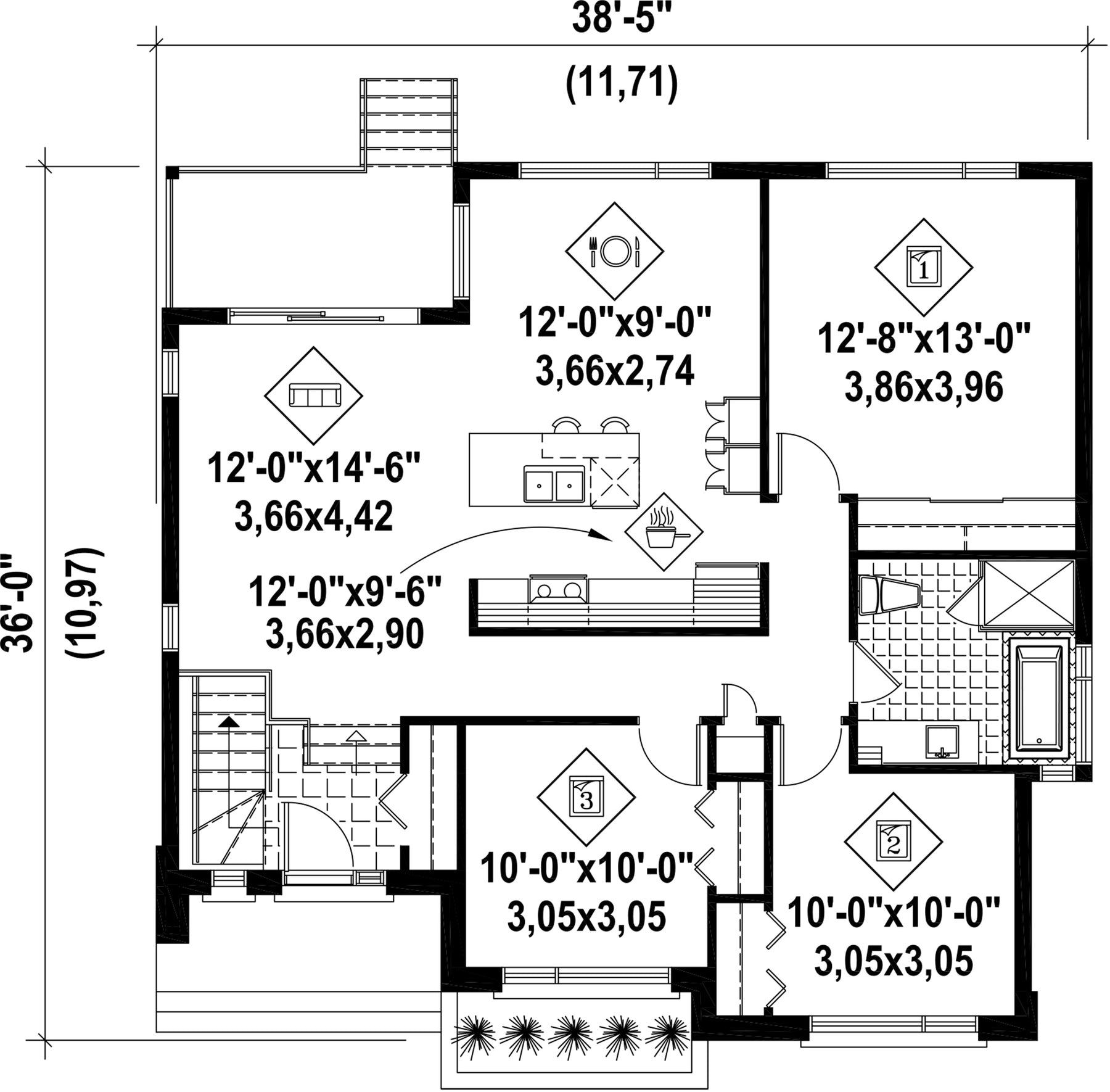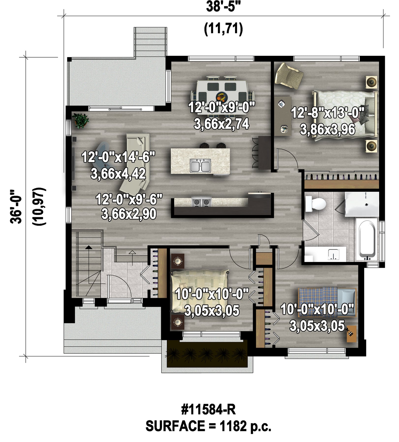 Cette élégante maison de plain-pied de style urbain mesure 38 pieds 5 pouces de largeur sur 36 pieds de profondeur et offre une surface habitable de 1 182 pieds carrés.