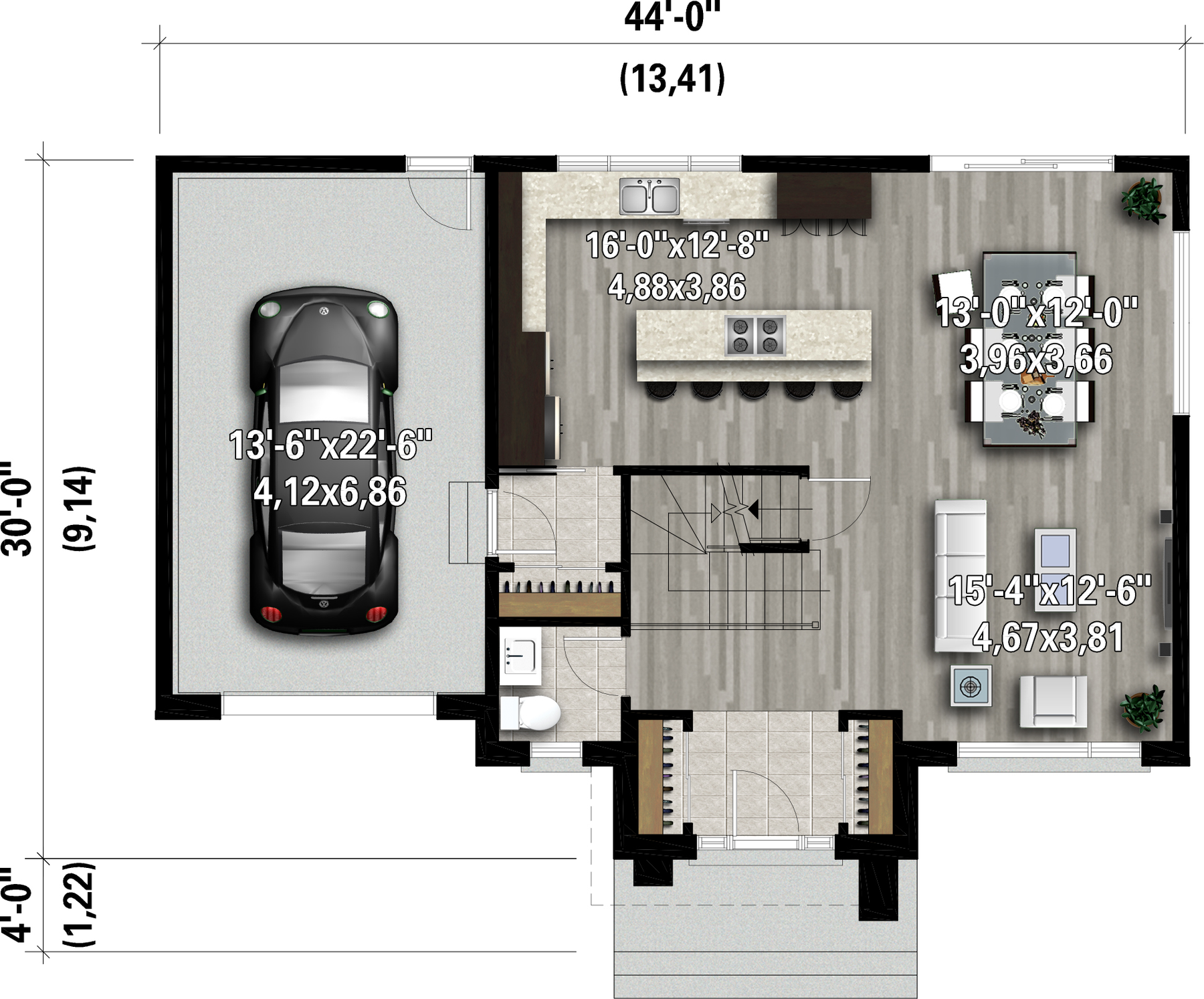 Le rez-de-chaussée à aires ouvertes de 833 pieds carrés compte un garage avec une entrée fermée qui donne accès à la cuisine, celle-ci ayant un îlot pouvant accueillir 5 à 6 personnes, une salle à manger, une salle d’eau et un salon.