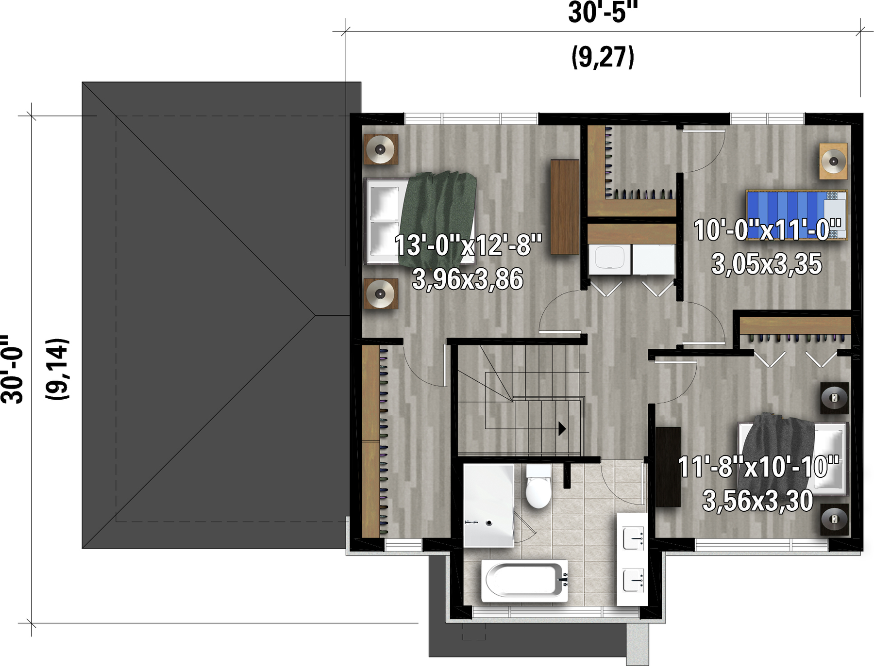 L’étage d’une surface habitable de 833 pieds carrés abrite trois chambres, un placard pour la laveuse et la sécheuse, ainsi qu’une salle de bains avec une douche séparée et un bain autoportant. La chambre des maîtres et la chambre 3 possèdent une grande penderie.