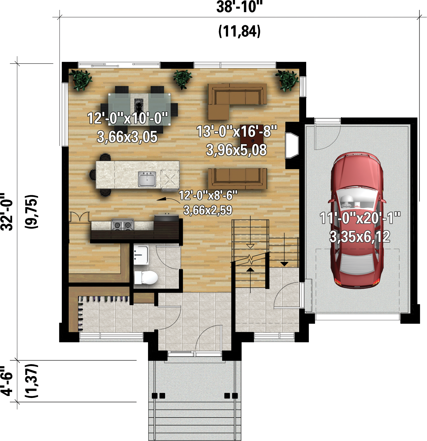 Le porche et les fenêtres étroites pleine hauteur donnent à la façade de cette maison à étage une allure originale et contemporaine. Elle mesure 38 pieds 10 pouces de largeur sur 32 pieds de profondeur et possède une surface habitable de 1 866 pieds carrés. Elle dispose également d’un garage de 264 pieds carrés qui peut loger une voiture.