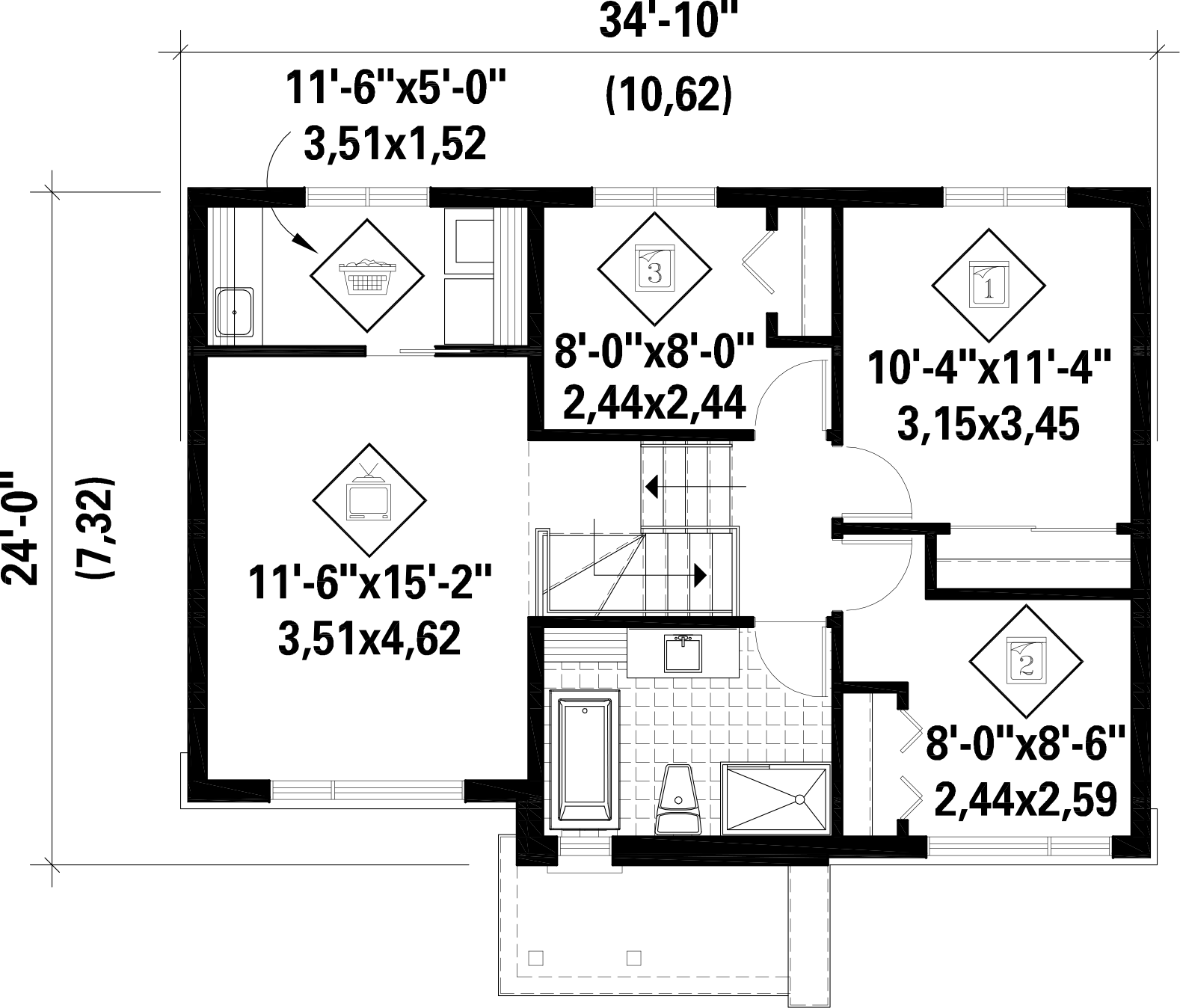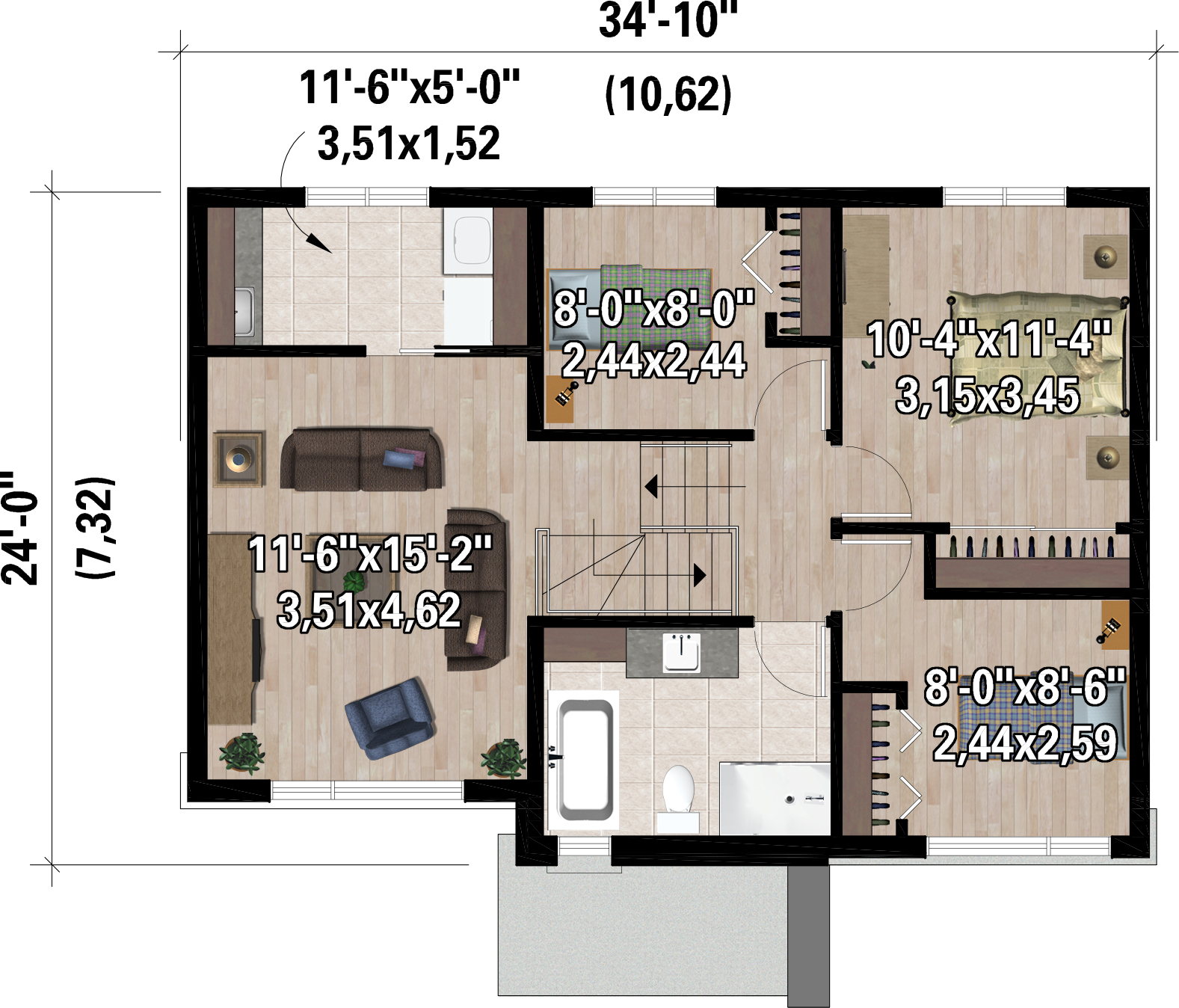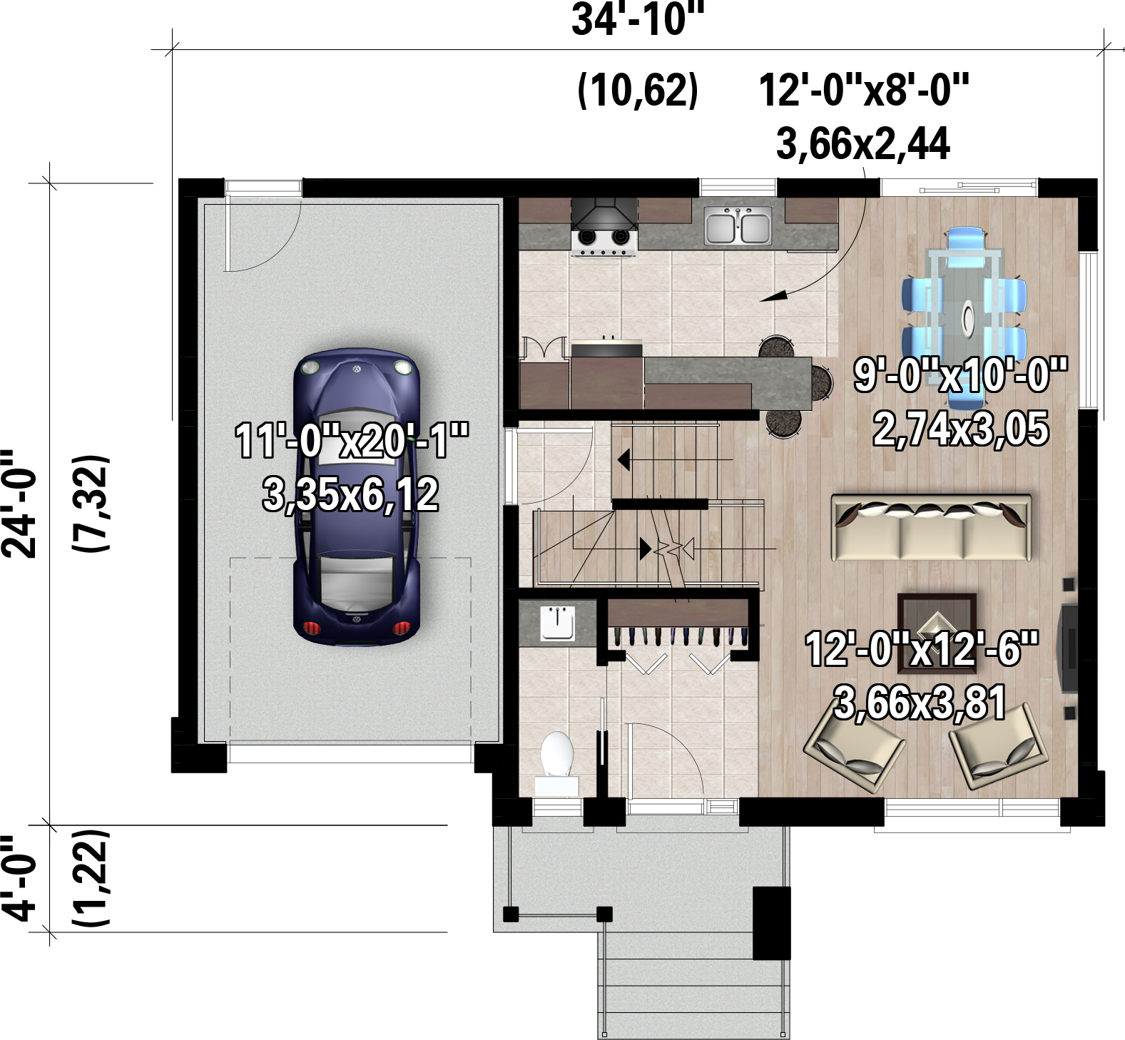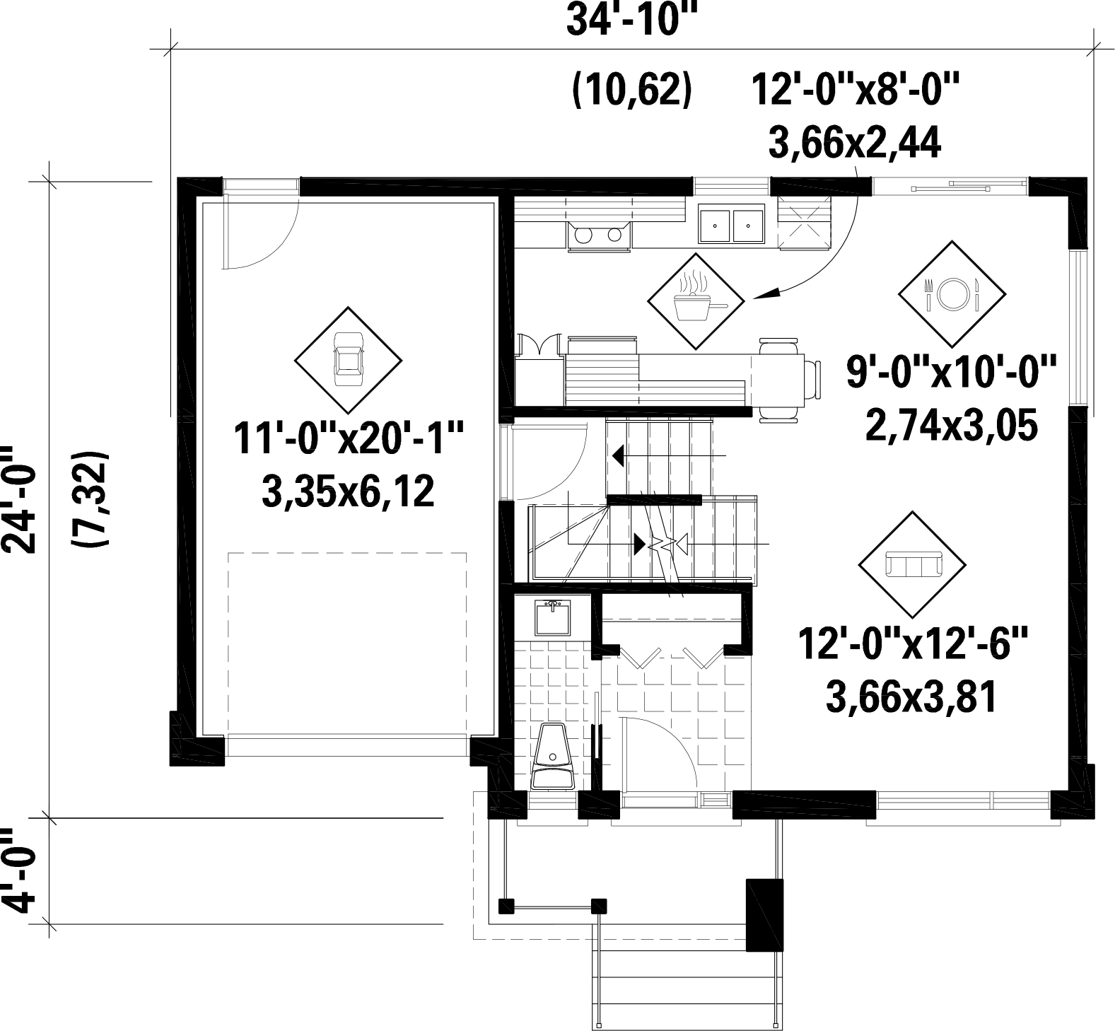 Cette maison à étage d’allure urbaine mesure 34 pieds de largeur sur 24 pieds de profondeur et offre une surface habitable de 1 322 pieds carrés. Avec une superficie de 264 pieds carrés, le garage peut loger une voiture.