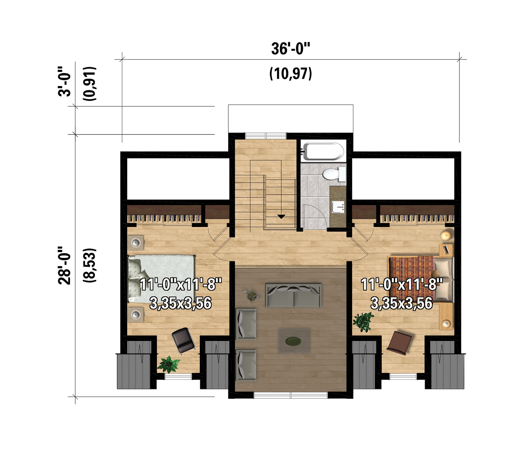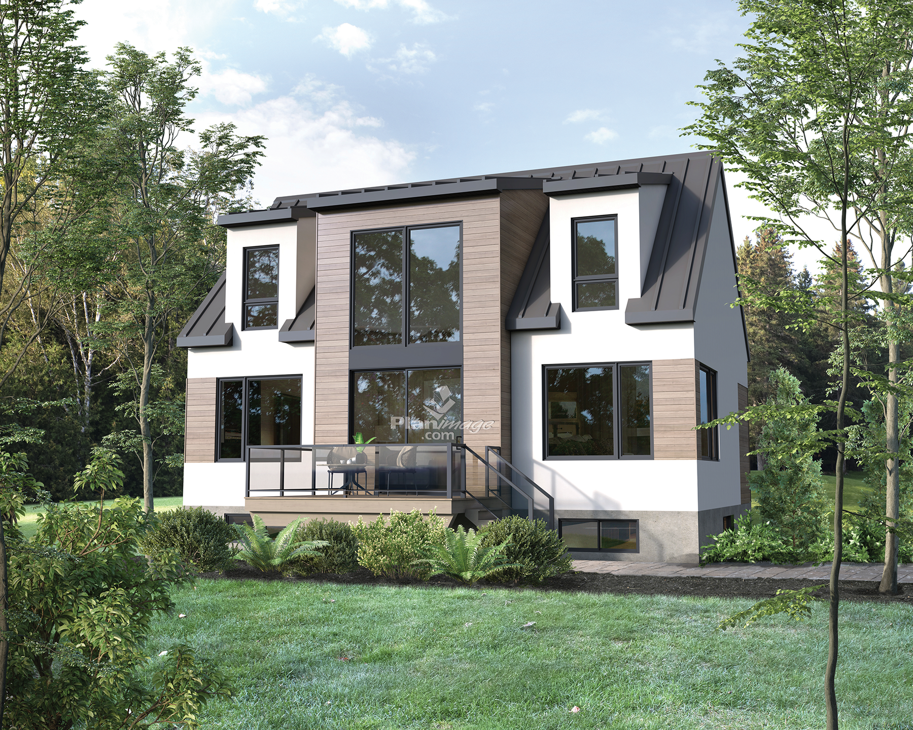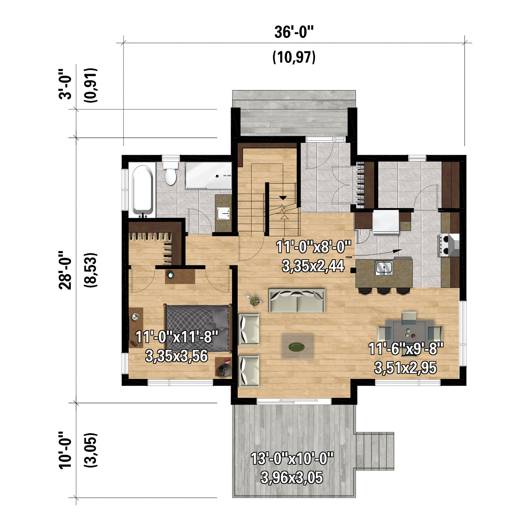 Grand chalet avec salon ouvert sur l'étage et grande buanderie accessible par la cuisine. Ce modèle mesure 36 pieds de largeur par 28 pieds de profondeur et sa surface habitable est de 1511 pieds carrés.