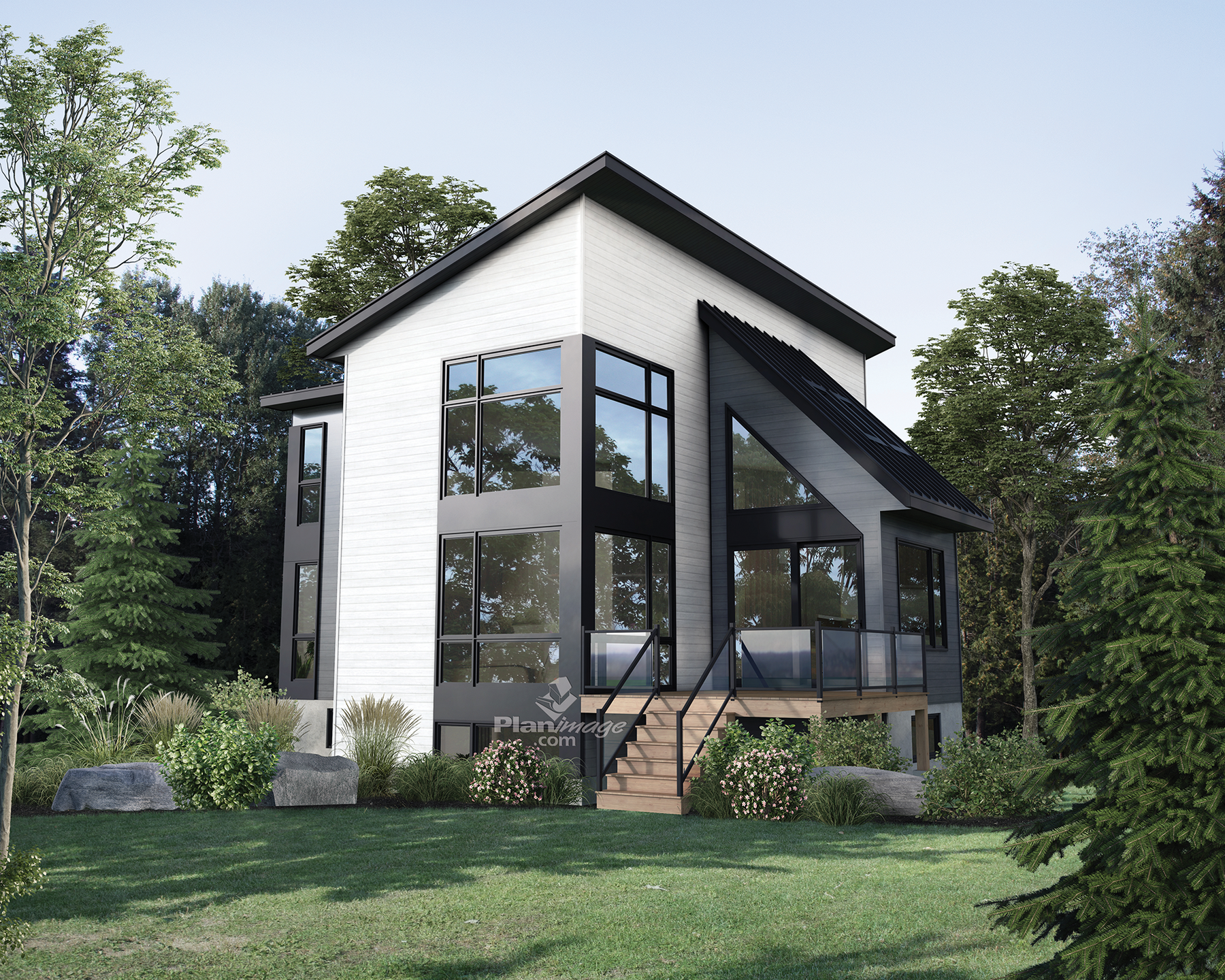 Grand chalet de 4 chambres avec salon en double hauteur, foyer et salle à manger en plafond cathédrale. Ce modèle mesure 40 pieds de largeur par 38 pieds de profondeur et sa surface habitable est de 1878 pieds carrés.