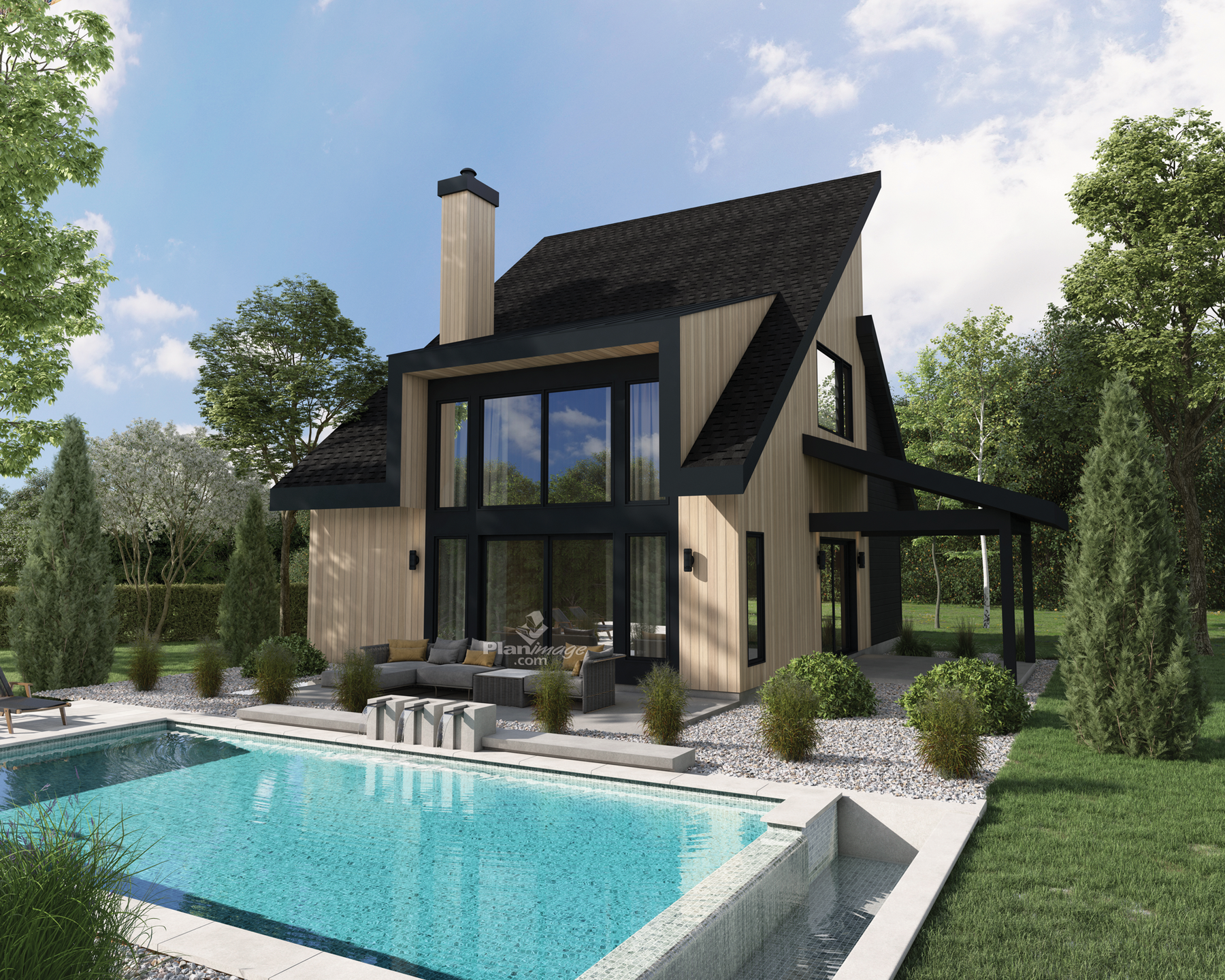Le contraste du bois et du noir des fenêtres donne un beau look à ce chalet. La façade est de 26 pieds et la profondeur est de 38 pieds. On y compte une chambre à coucher, une salle de bain ainsi qu’une cuisine, un salon avec foyer et une salle à dîner à aire ouverte. À l’étage, une mezzanine comprend la chambre à coucher avec une salle de bain complète. La superficie de l’étage est de 400 pieds carrés.