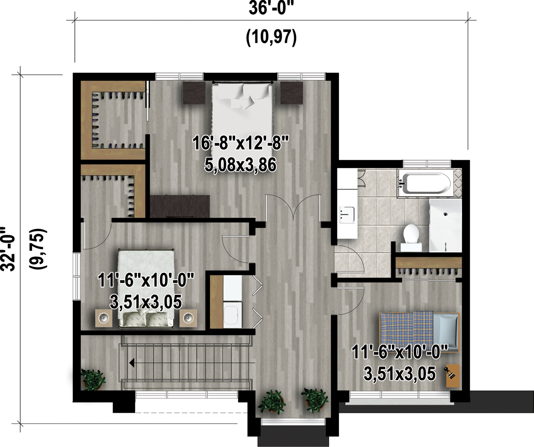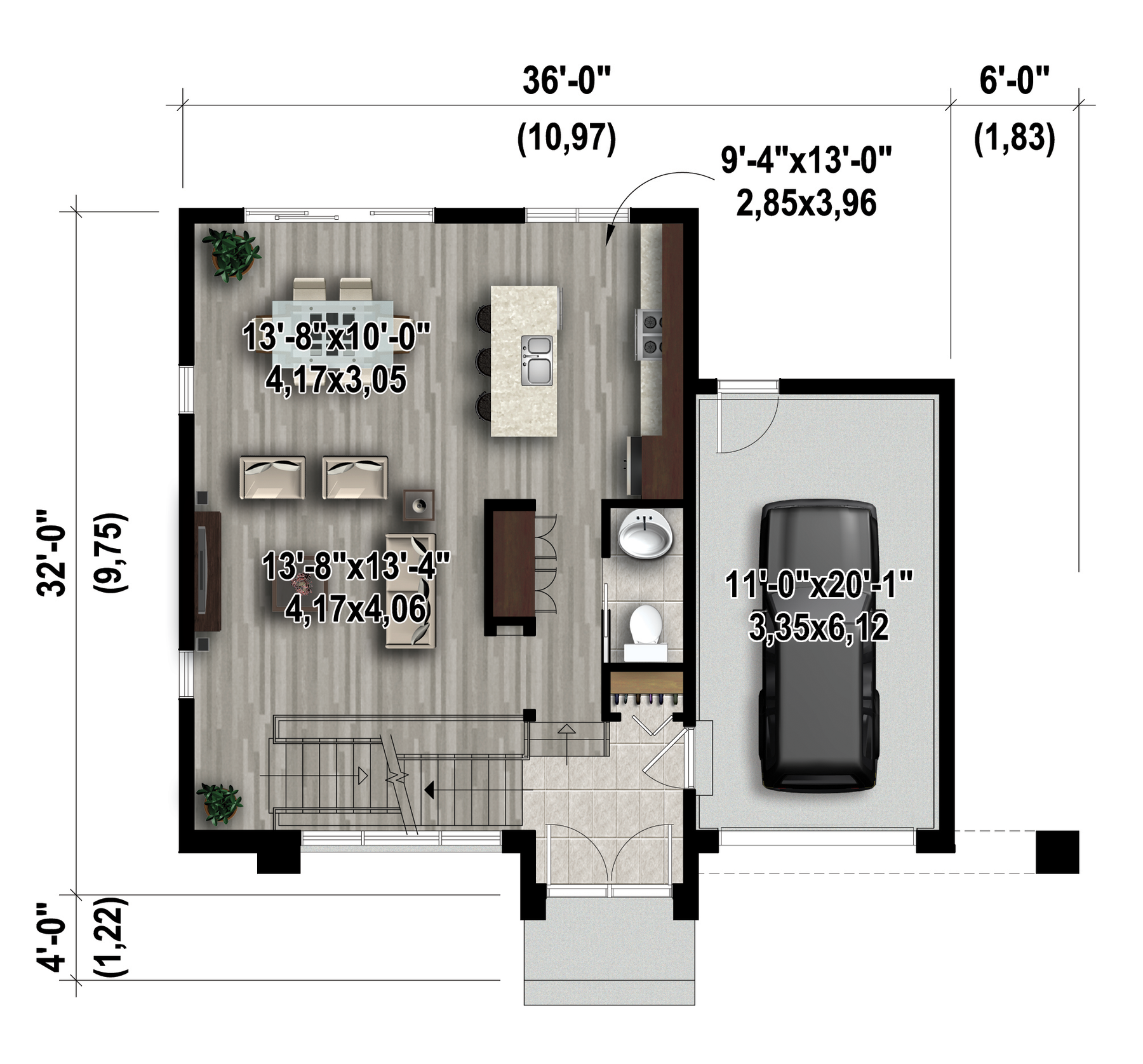 Cette maison à étage à l’architecture ultramoderne affiche un style résolument urbain avec ses volumes géométriques et son immense mur vitré à l’avant. Cette demeure fait 36 pieds de largeur sur 32 pieds de profondeur et offre une surface habitable de 1 736 pieds carrés en plus d'un garage simple de 264 pieds carrés.