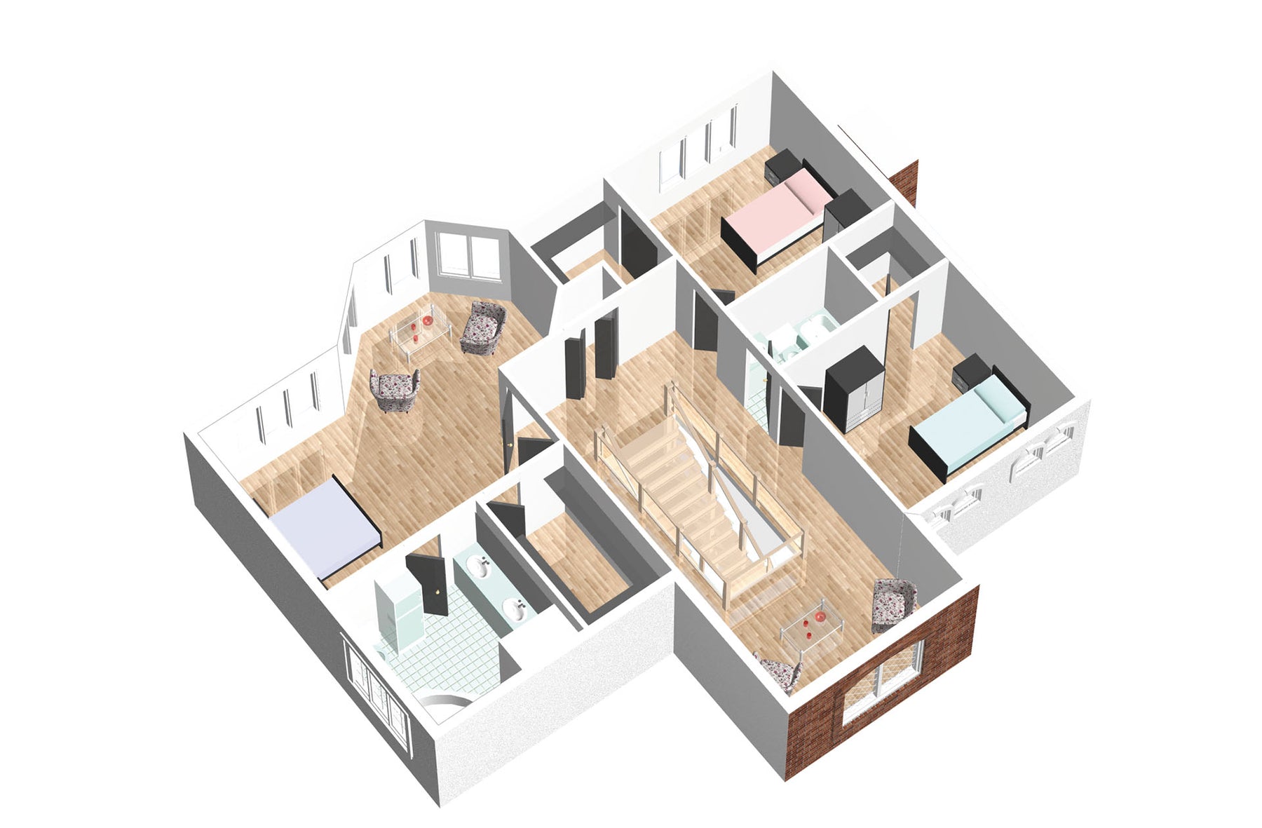 L’étage de 1 402 pieds carrés comprend une salle de lecture, une salle de bains, trois chambres à coucher, dont une immense chambre principale avec salle de bains privée, une penderie et un coin lecture.