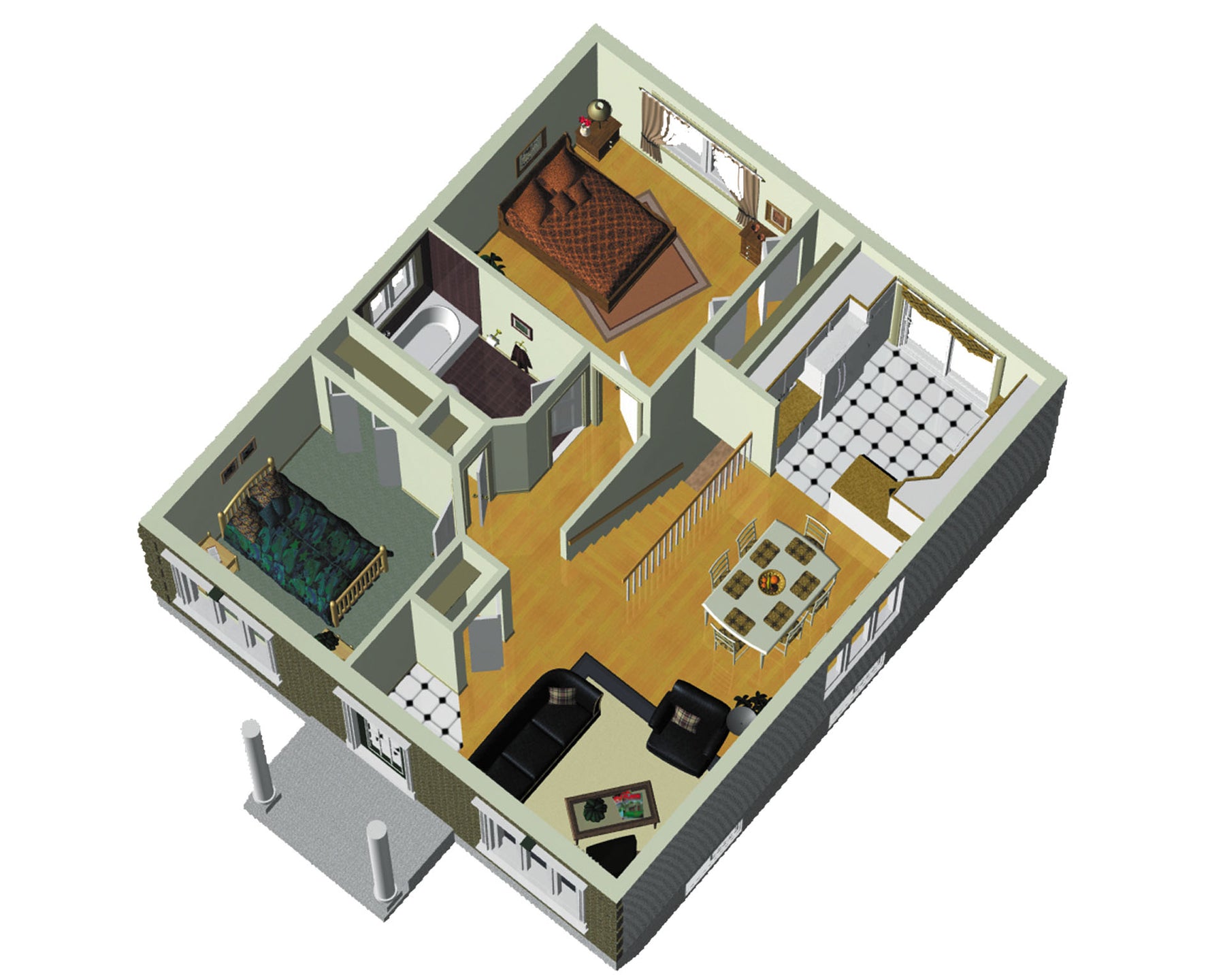 La maison comprend un salon et une salle à manger à aire ouverte, une cuisine, deux chambres et une salle de bains.