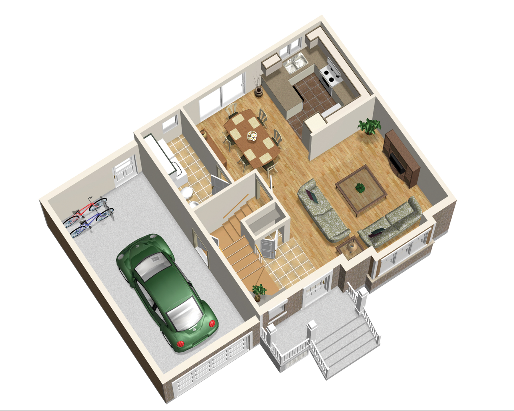 Le rez-de-chaussée fait 597 pieds carrés et comprend un hall d’entrée ouvert, une salle d’eau avec espace pour la laveuse et la sécheuse, un salon, une cuisine en U et une salle à manger donnant sur la terrasse arrière.