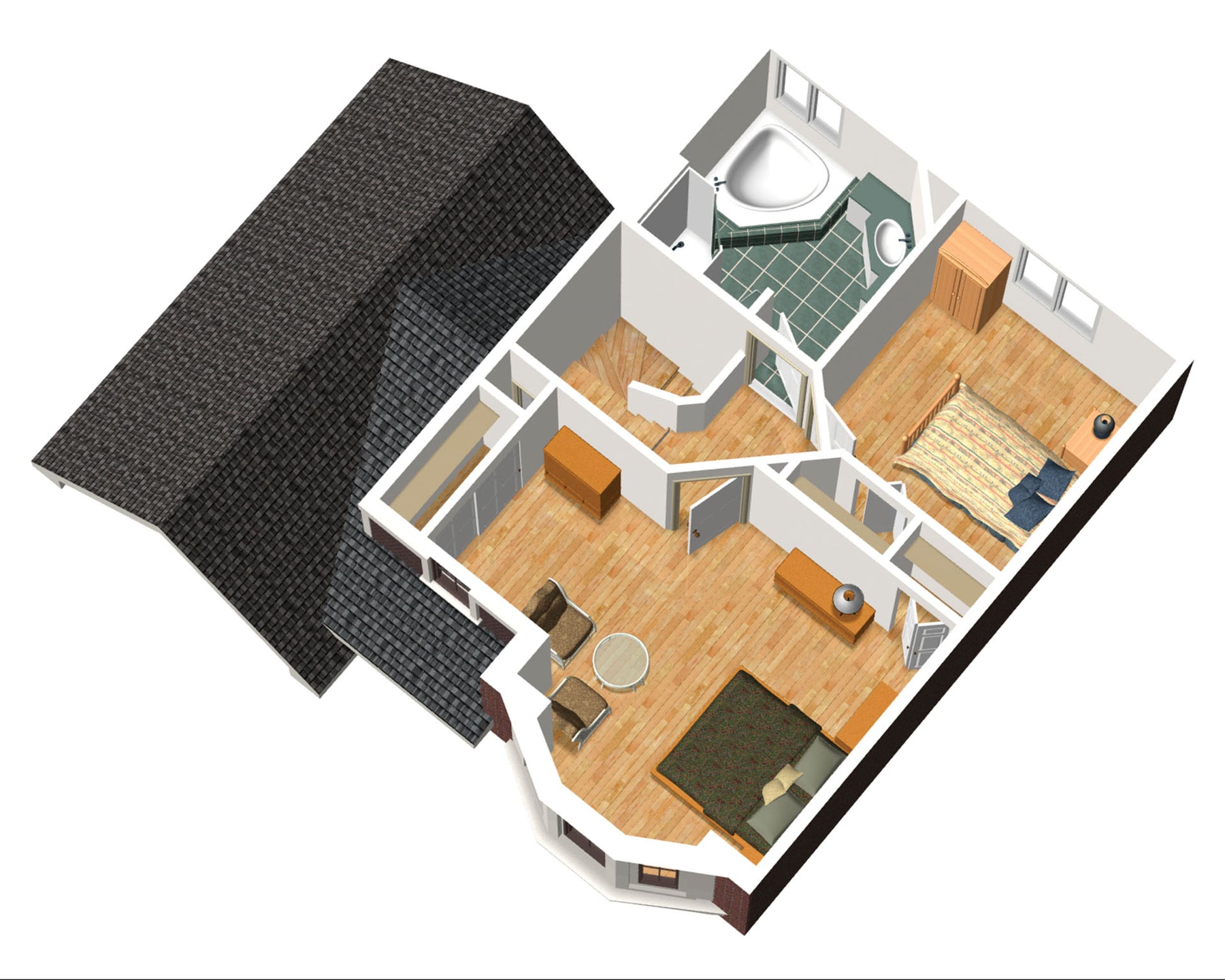 | Chambre des maîtres - commentaires | Grande chambre des maîtres avec tourelle et garde-robe double | ||