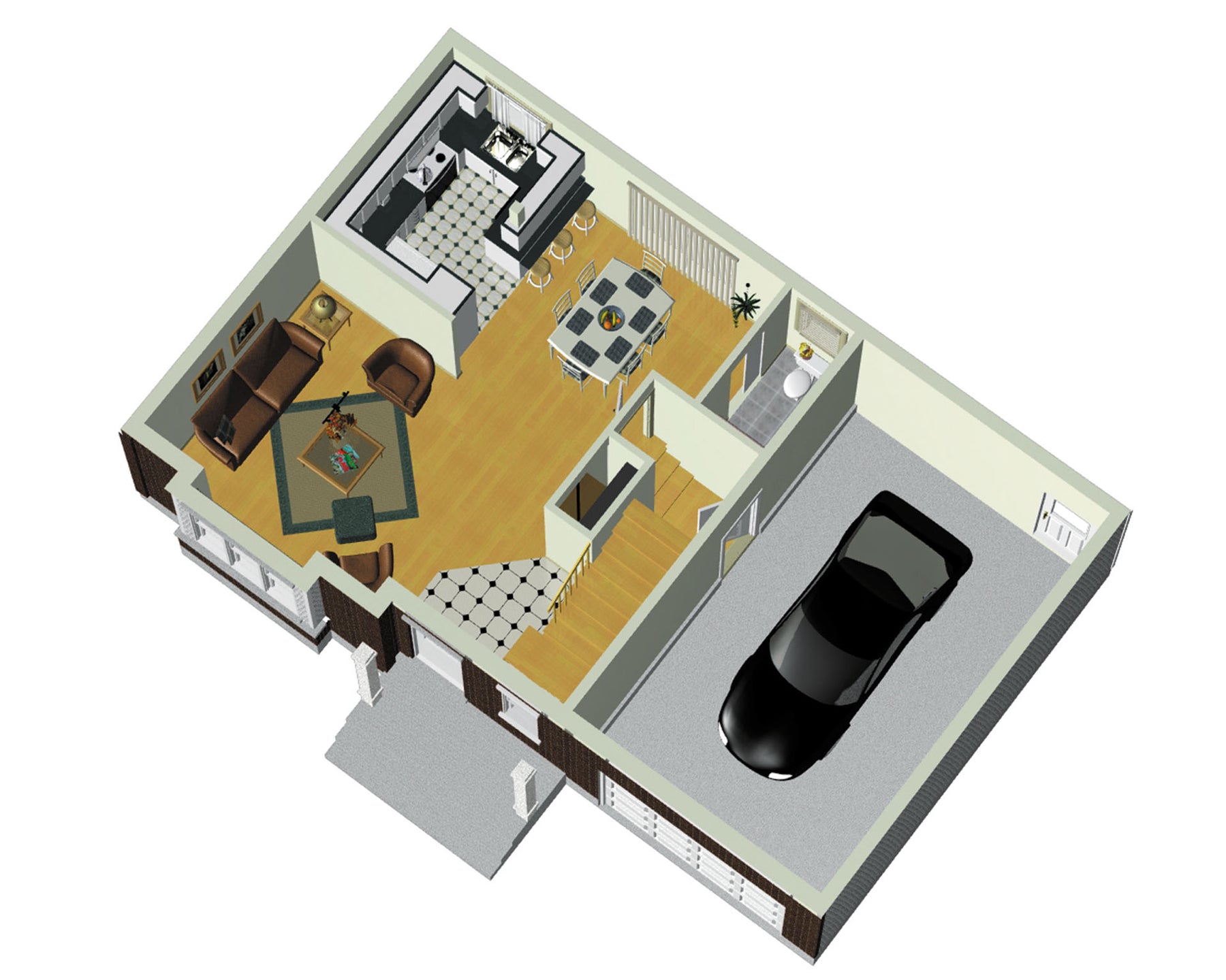 Possédant une superficie de 575 pieds carrés, le rez-de-chaussée compte un salon, une salle à manger, une cuisine en U, et une salle d’eau. La demeure dispose également d’un garage de 322 pieds carrés pouvant loger une voiture.