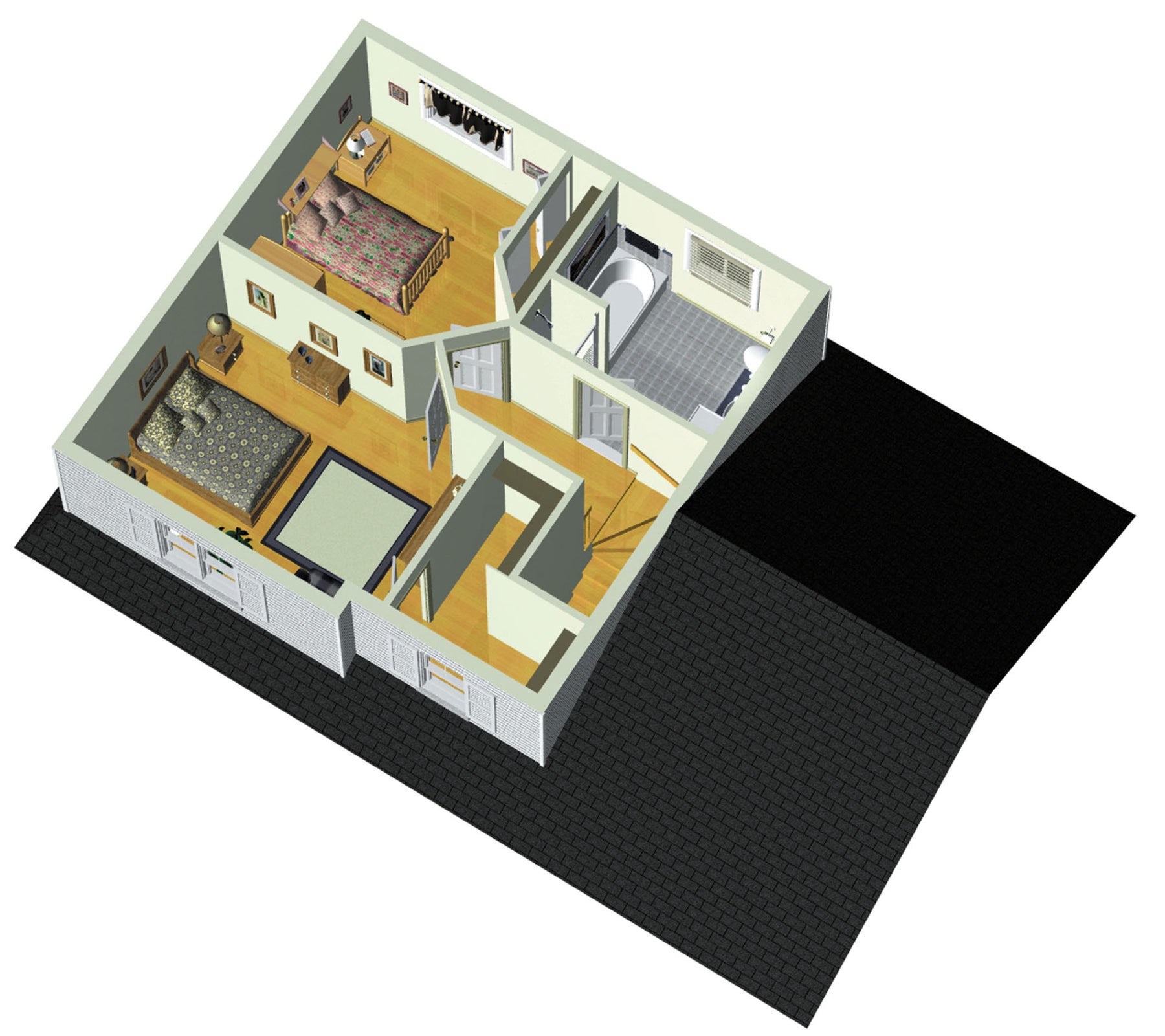 L’étage de 567 pieds carrés comprend une salle de bains et deux chambres dont une chambre principale aménagée avec une grande penderie.