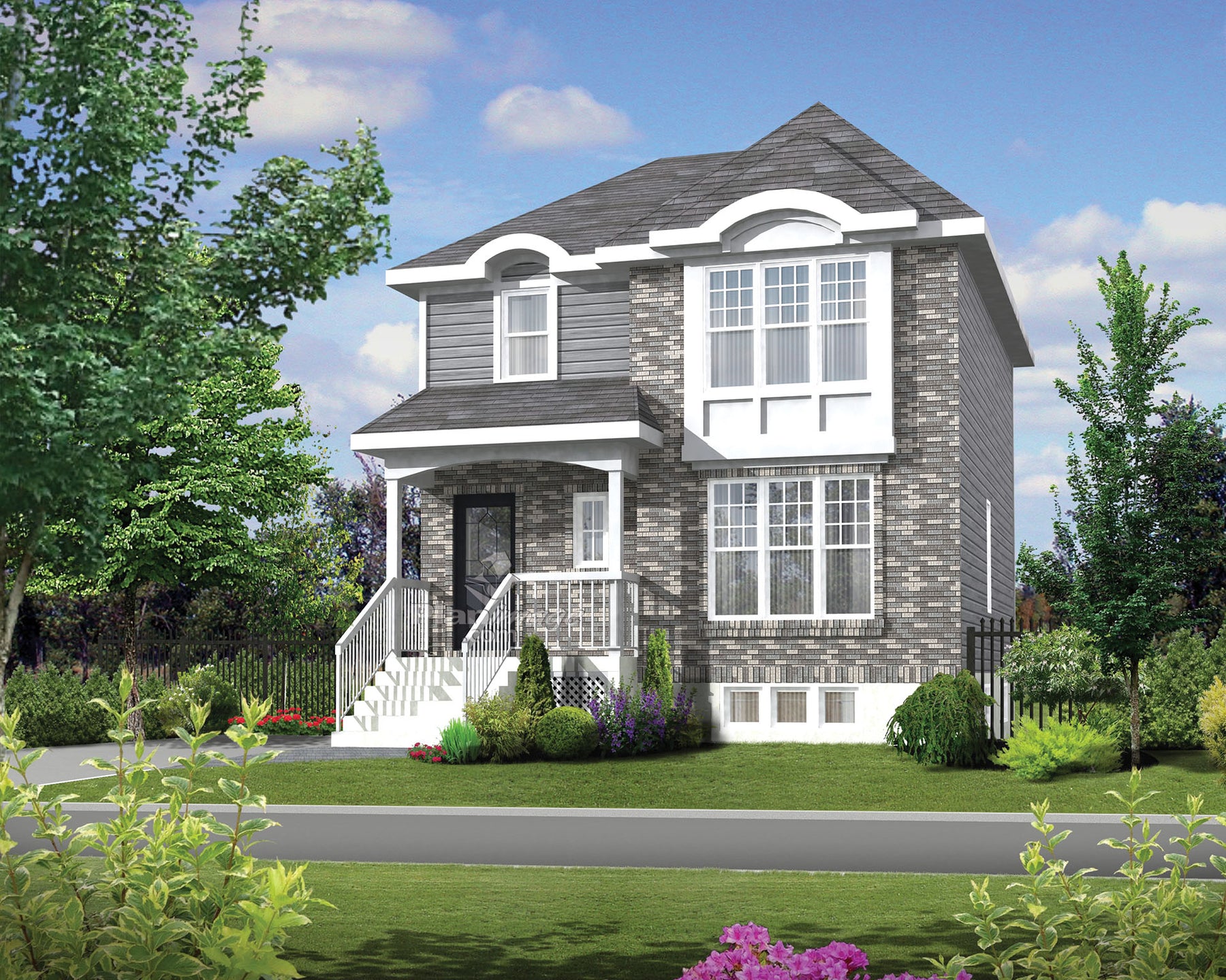 L’apparence de cette attrayante maison à étage à la façade de briques et d’aluminium est rehaussée par le porche avec colonnes décoratives qui surplombe l’entrée. La demeure offre une surface habitable de 1 330 pieds carrés et mesure 24 pieds de largeur sur 28 pieds de profondeur.