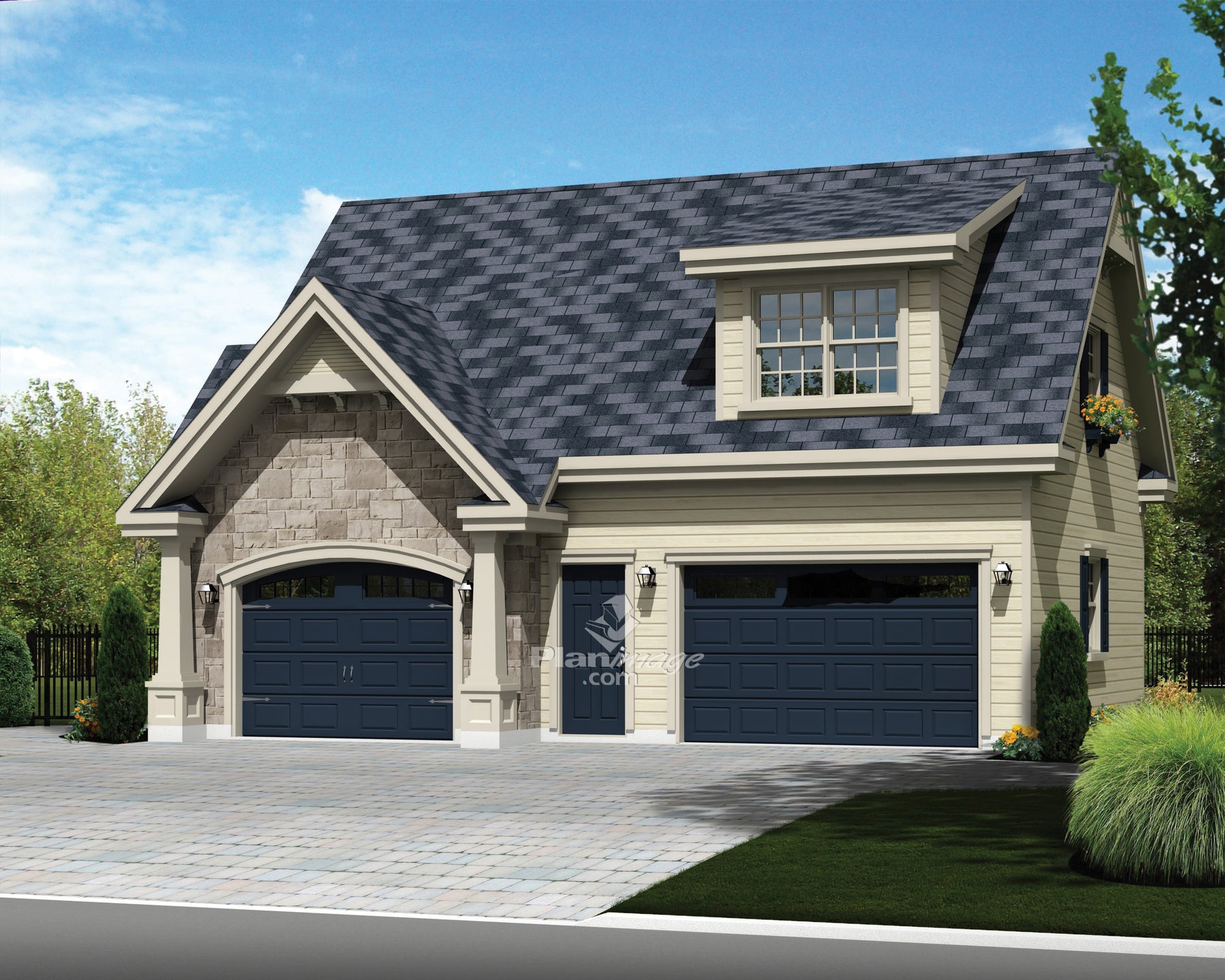 D'un style chaleureux et invitant avec sa jardinière sous une fenêtre, ce garage double avec loft vous ravira. Il compte deux grandes portes pour les voitures et une porte de service au centre ainsi qu'une seconde porte à l'arrière. Deux fenêtres situées de chaque côté du garage éclairent la pièce.