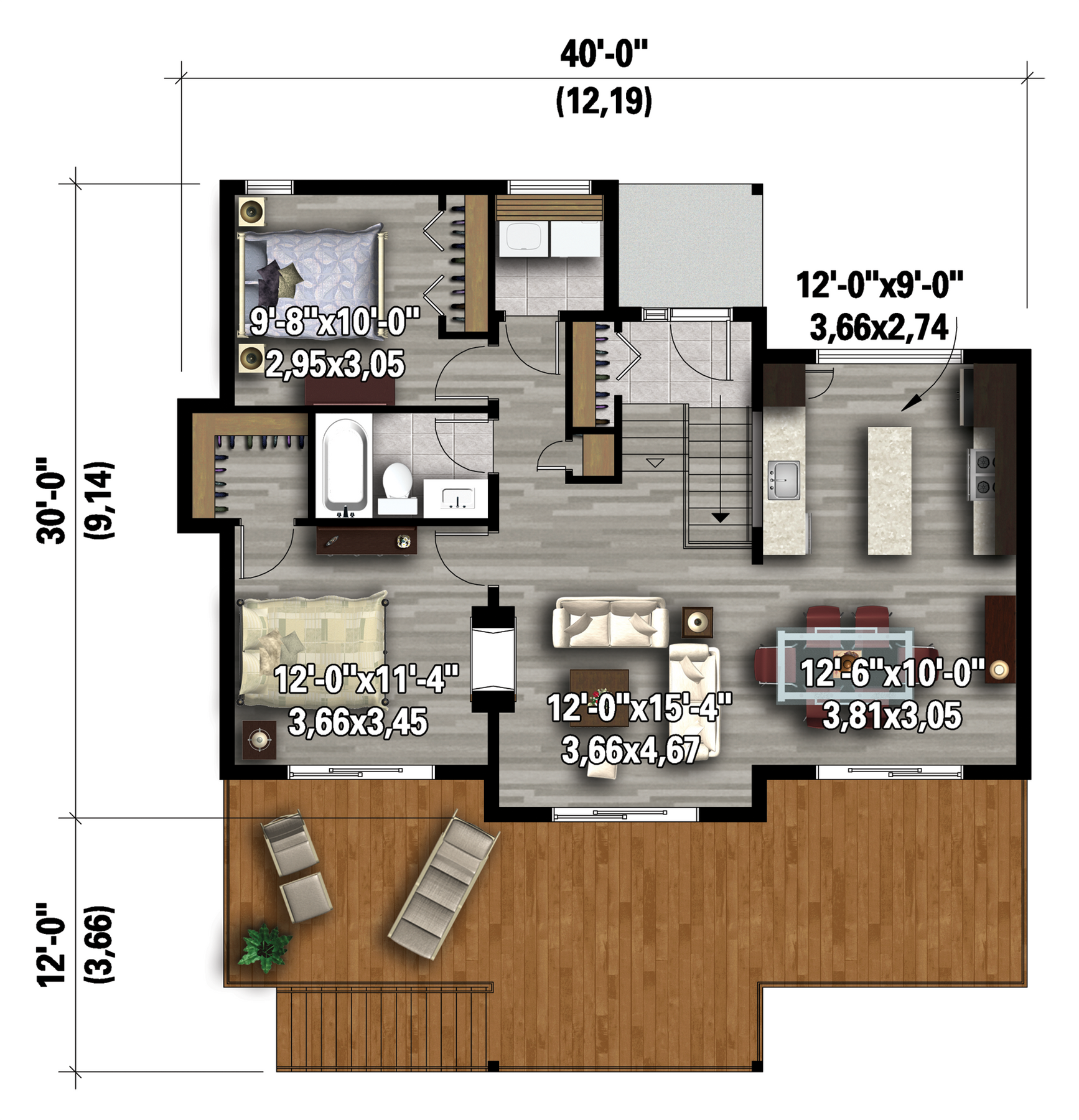 Idéal pour les amoureux de la nature, ce chalet de style urbain fait 40 pieds de largeur sur 30 pieds de profondeur et possède une superficie habitable de 960 pieds carrés. La hauteur des plafonds varie à l’intérieur : la cuisine et la salle à manger ont des plafonds de 9 pieds de haut, celui du salon est à 10 pieds et ceux des chambres ont 8 pieds de haut.