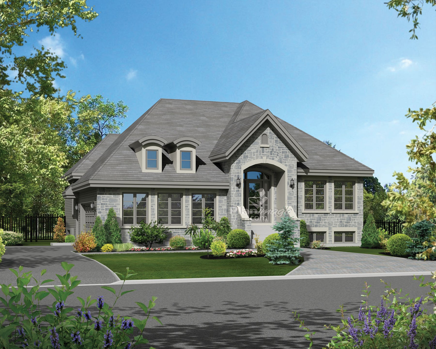 Cette prestigieuse résidence à la façade de pierres dispose d’une fenestration abondante et d’un imposant porche surplombant l’entrée. Elle mesure 44 pieds de largeur sur 44 pieds de profondeur et offre une surface habitable de 1 480 pieds carrés.
