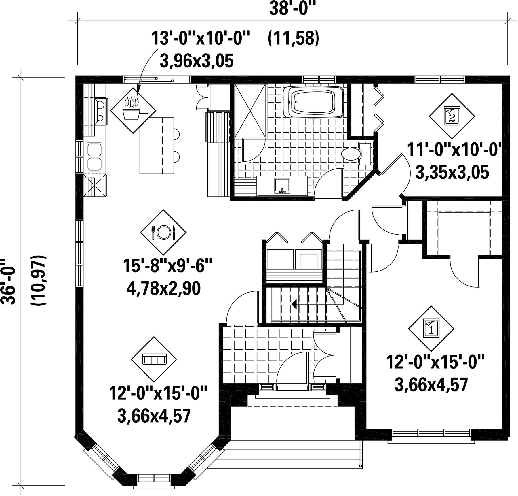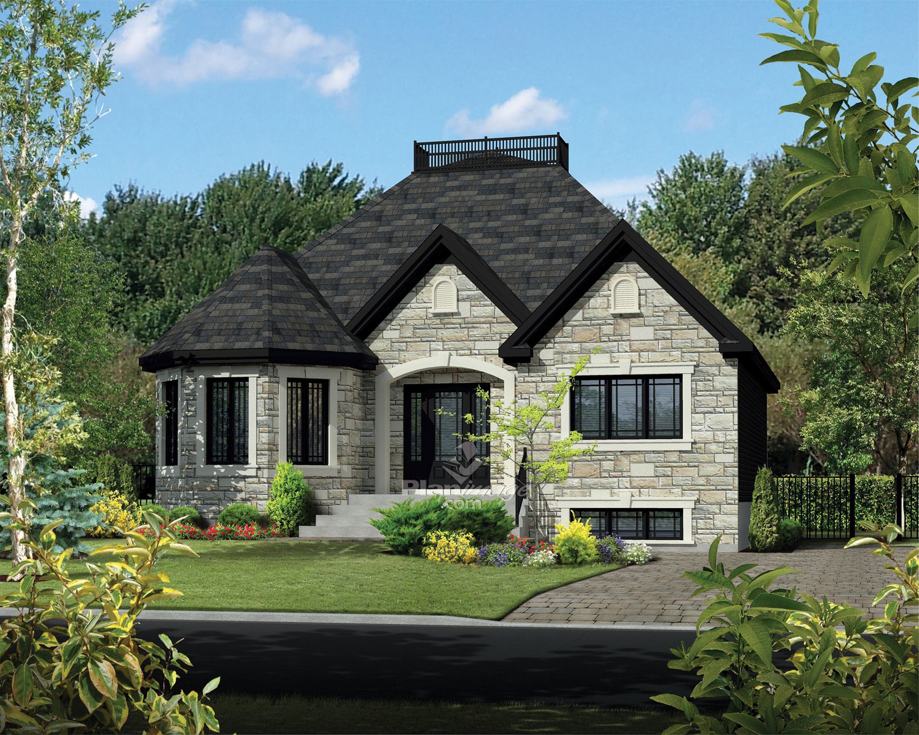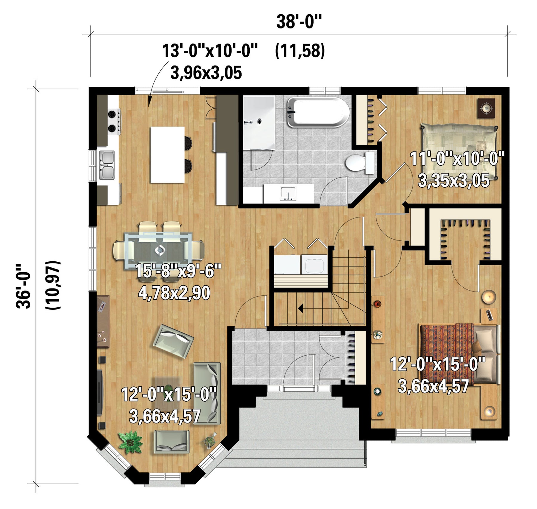 Cette maison de plain-pied à l'architecture élégante possède une jolie tourelle sur le devant et mesure 38 pieds de largeur sur 36 pieds de profondeur. Elle offre une surface habitable de 1 210 pieds carrés.