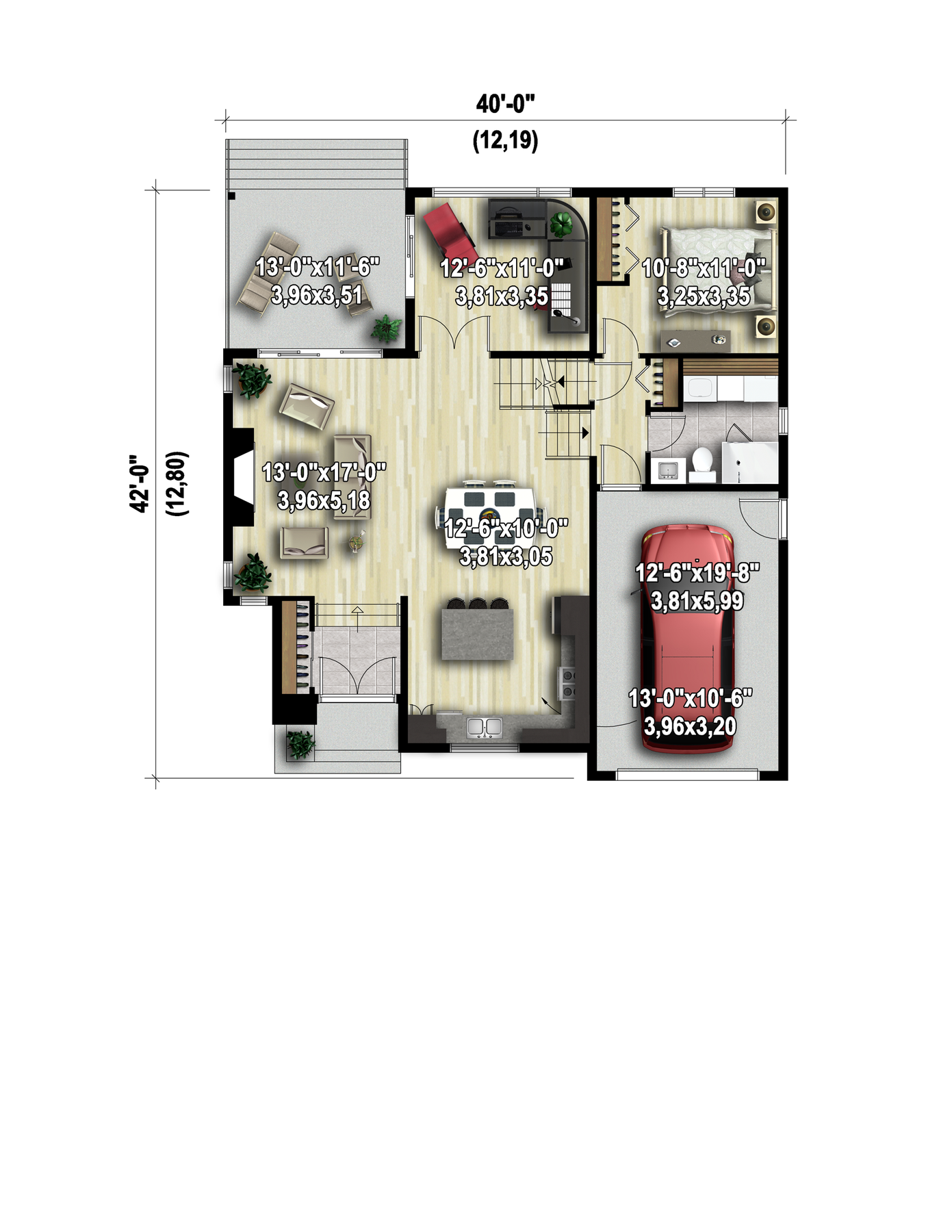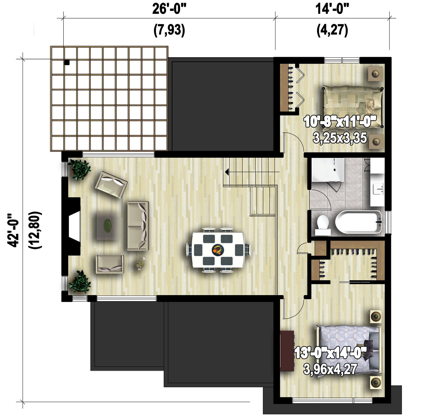 Cette magnifique maison à paliers au toit plat se distingue par son design épuré et par son revêtement extérieur d’aluminium, d’agrégat et de bois posé à l’horizontale qui lui confère un style architectural contemporain. Ce modèle mesure 40 pieds de largeur sur 42 pieds de profondeur, possède une surface habitable de 1 720 pieds carrés et compte un garage de 278 pieds carrés pouvant loger une voiture.