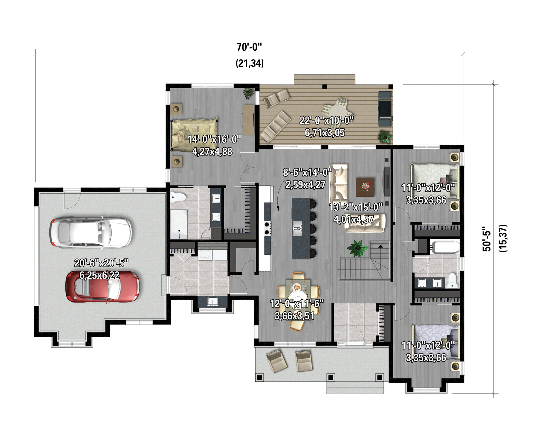 Magnifique maison plain-pied de 70 pieds de façade et 50 pieds 5 pouces de profondeur, un garage pour deux voitures et beaucoup de luminosité. Par le garage, vous accédez à la salle de lavage qui elle vous conduit dans l’aire ouverte de la salle à manger, du salon et de la cuisine avec un îlot.