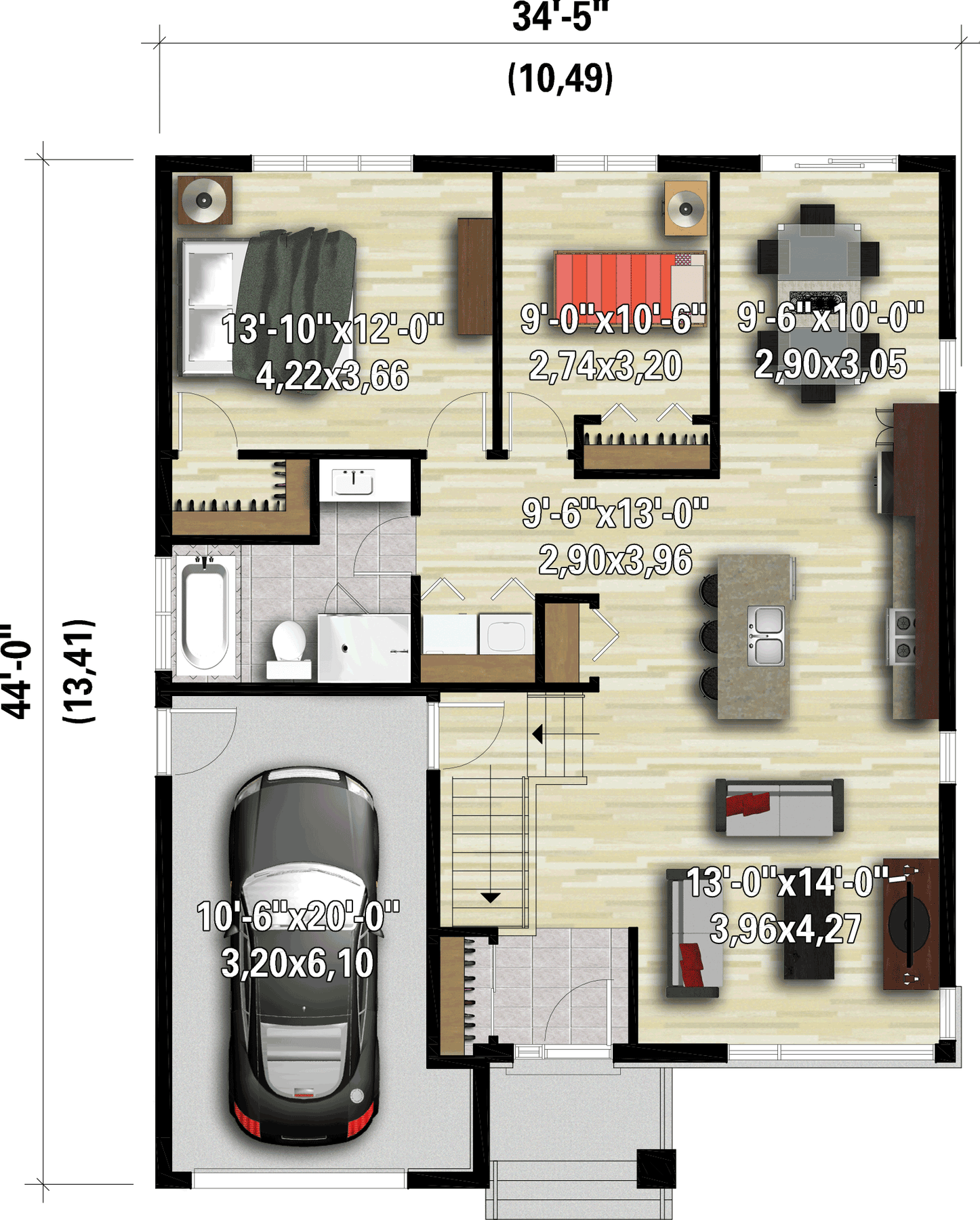 Cette maison de plain-pied de style urbain se démarque par ses lignes pures et les matériaux du revêtement extérieur : aluminium, brique, agrégat et bois. Elle mesure 34 pieds 5 pouces de largeur sur 44 pieds de profondeur, offre une surface habitable de 1 144 pieds carrés, et dispose d’un garage de 254 pieds carrés pouvant loger une voiture.