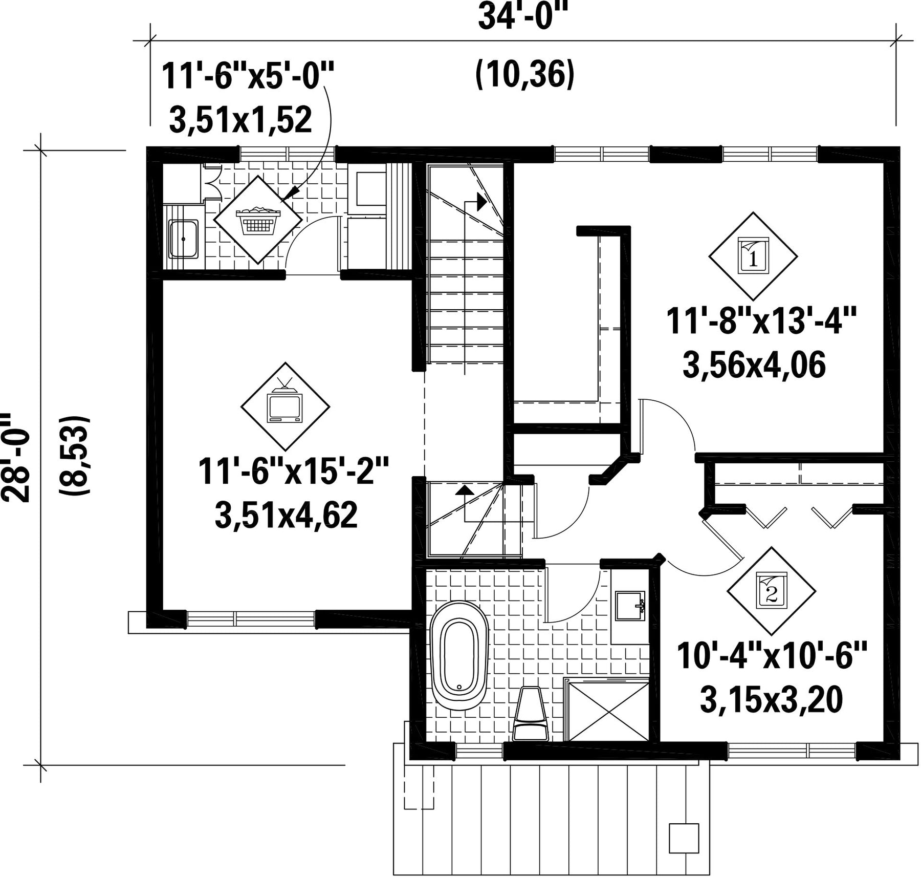 Avec son joli porche et ses fenêtres d’inspiration moderne, cette maison à étage de dimension modeste est accueillante en plus d'être fonctionnelle. Ce modèle à étage peut être aménagé selon les gouts et les besoins des propriétaires. (Série Aménagements multiples)