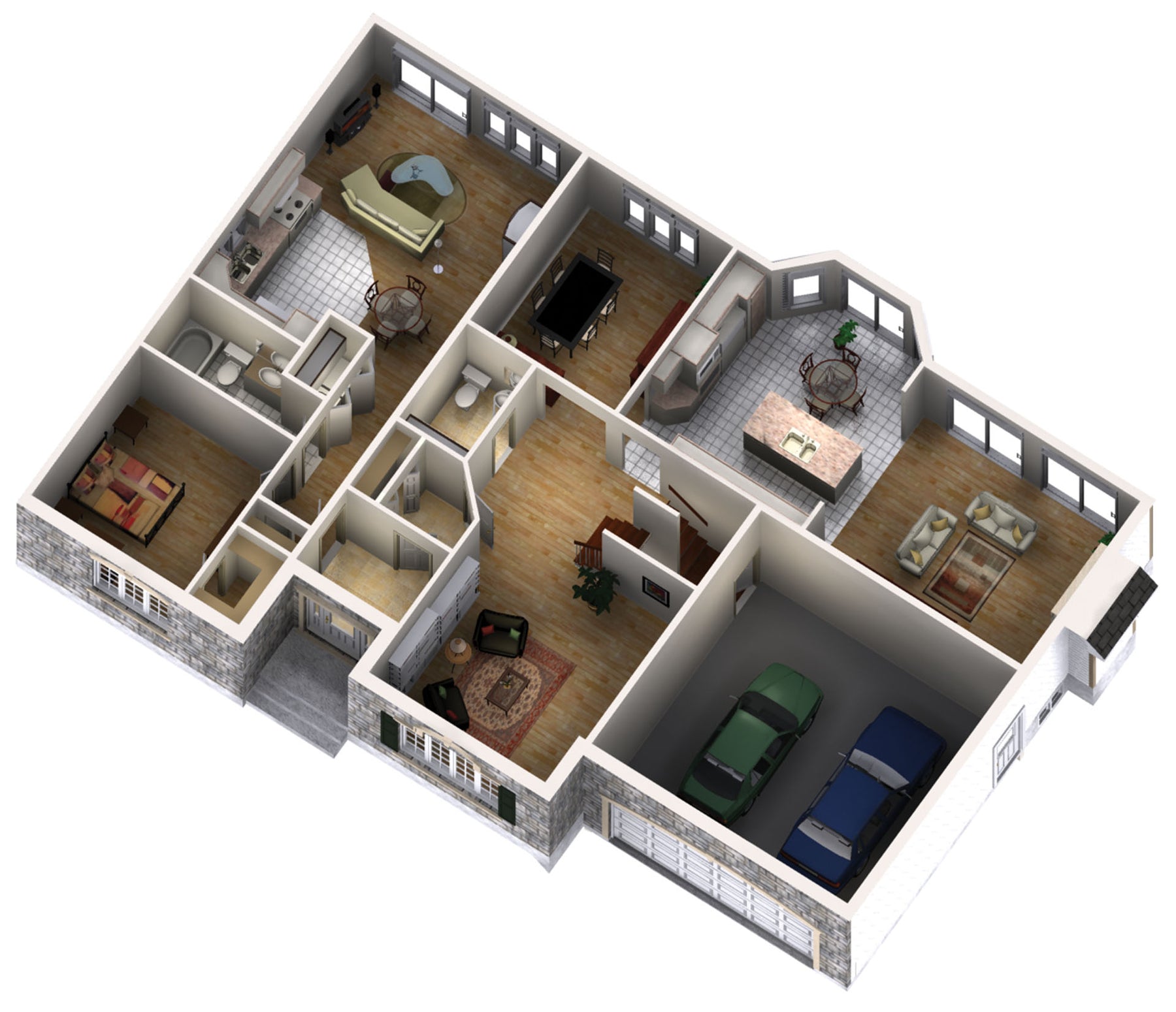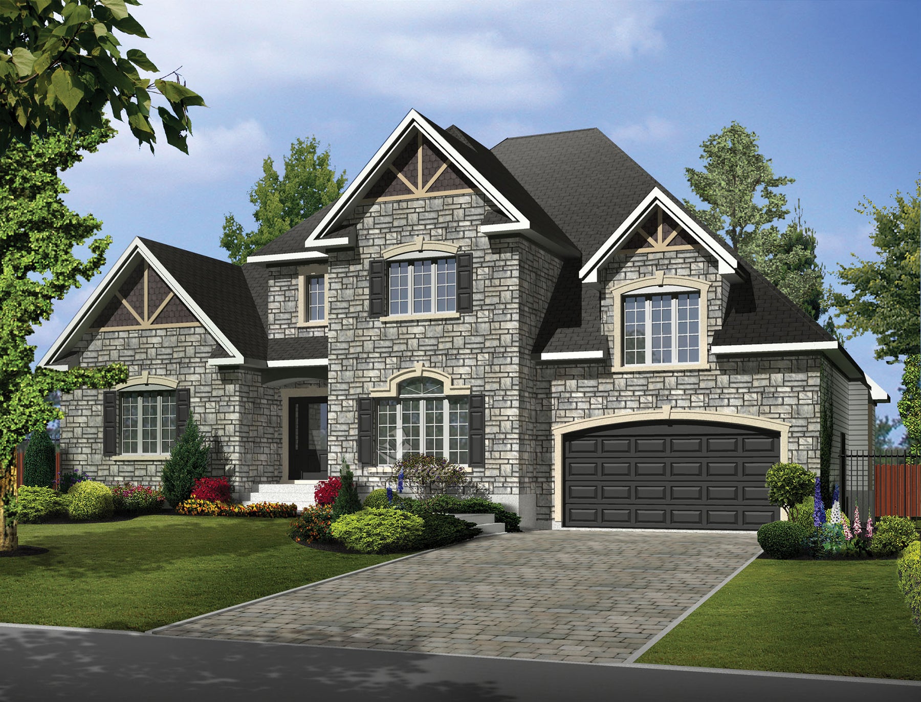 This prestigious 3,493 square foot multigenerational house stands out with its stone facing and fish scale detailing. The two-storey home is 62 feet wide by 42 feet deep and also has a 441 square foot two-car garage with a side door. Both dwelling units share a common front entrance.
