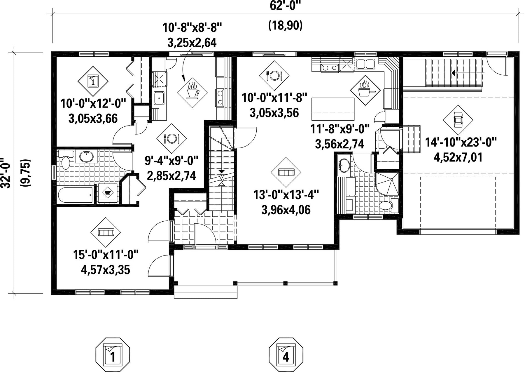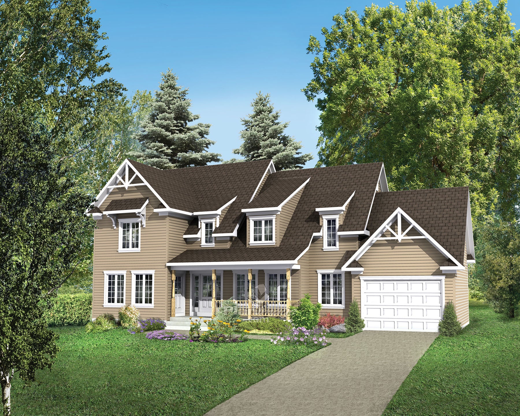 This country style multigenerational two-storey house is 62 feet wide by 32 feet deep and provides 2,655 square feet of living space. The 369 square foot one-car garage has access to the basement.