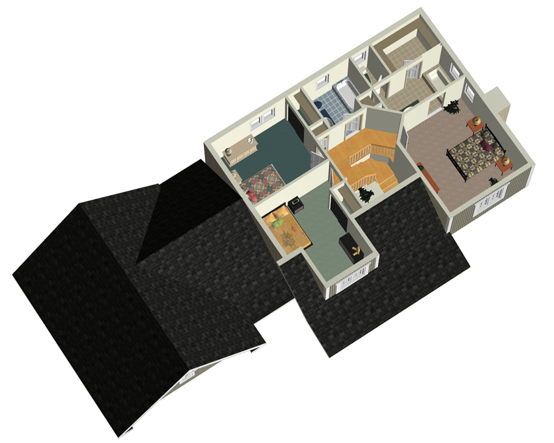 The upper floor, with 757 square feet of living area, includes a large bathroom and three bedrooms, one of which is a master bedroom with a private bathroom.