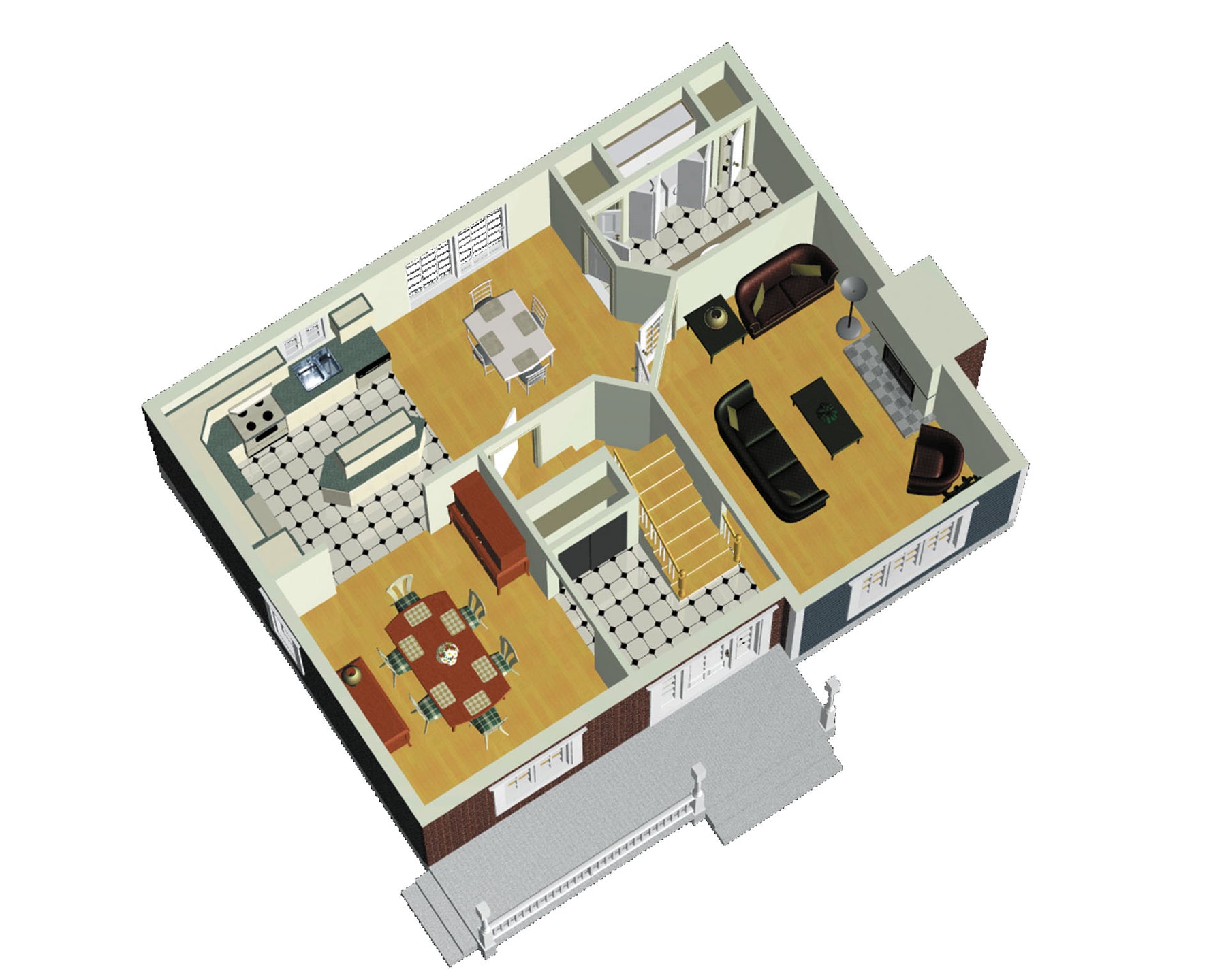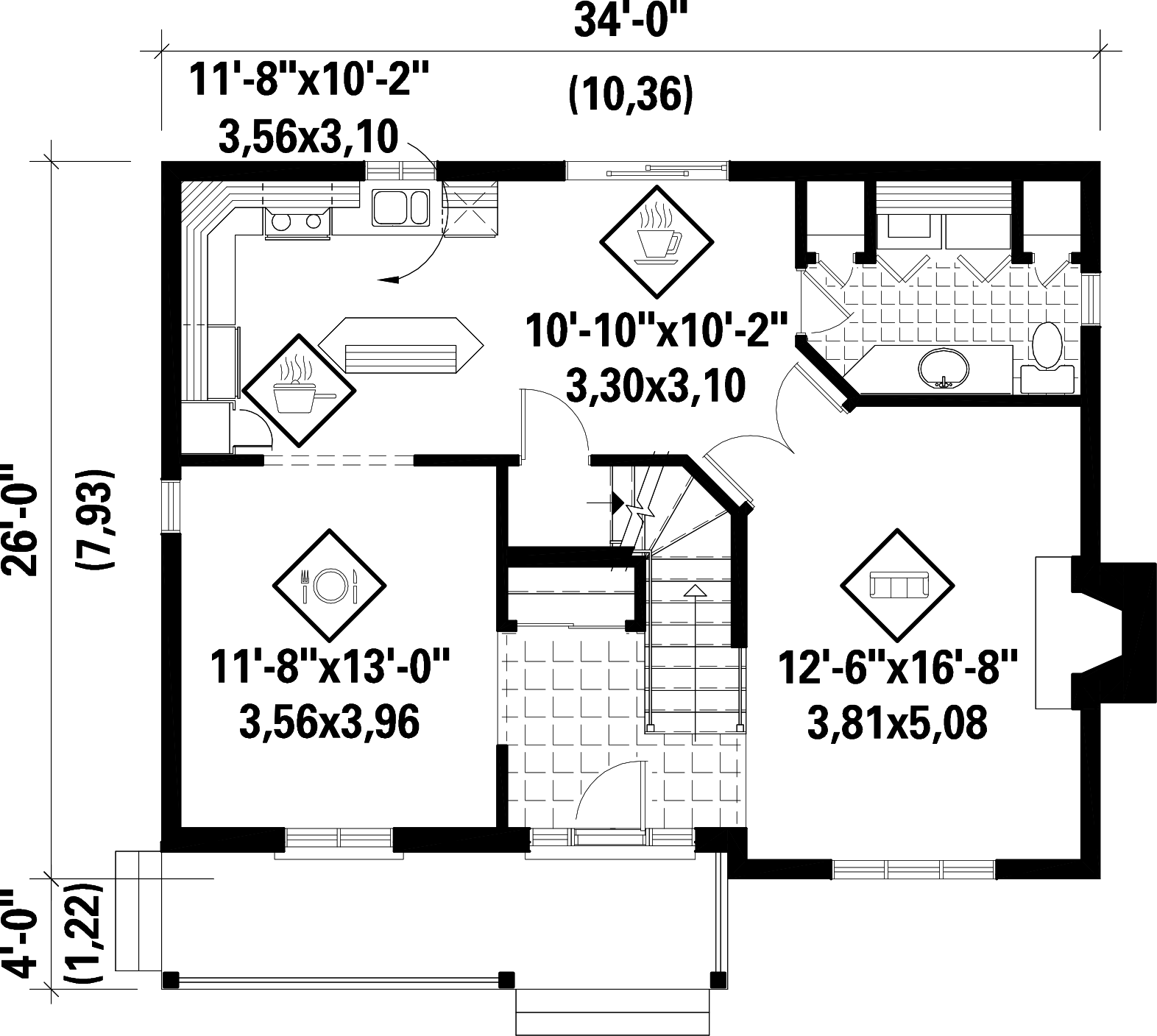 This country-style two-storey house is 34 feet wide by 26 feet deep and provides 1,591 square feet of living space.