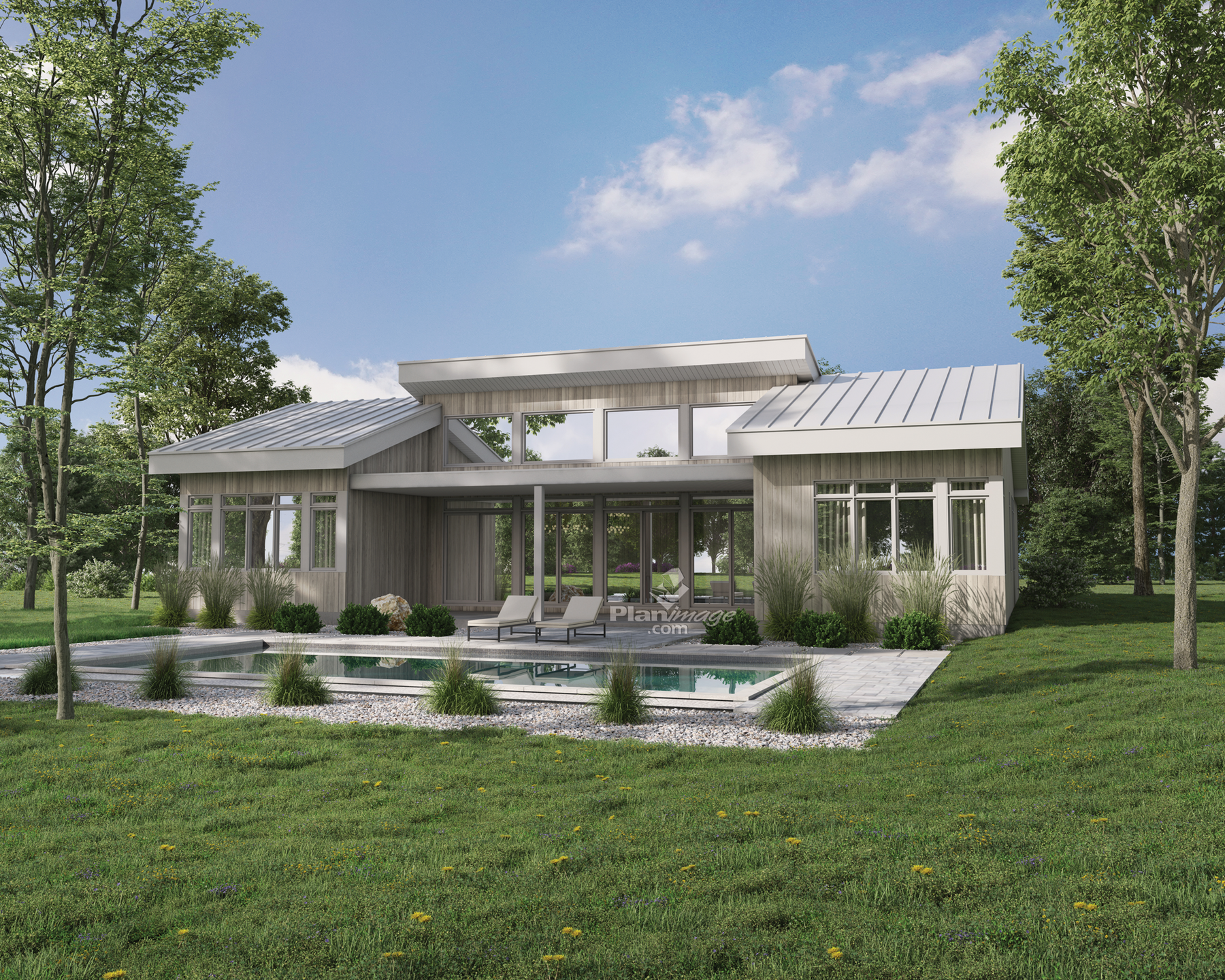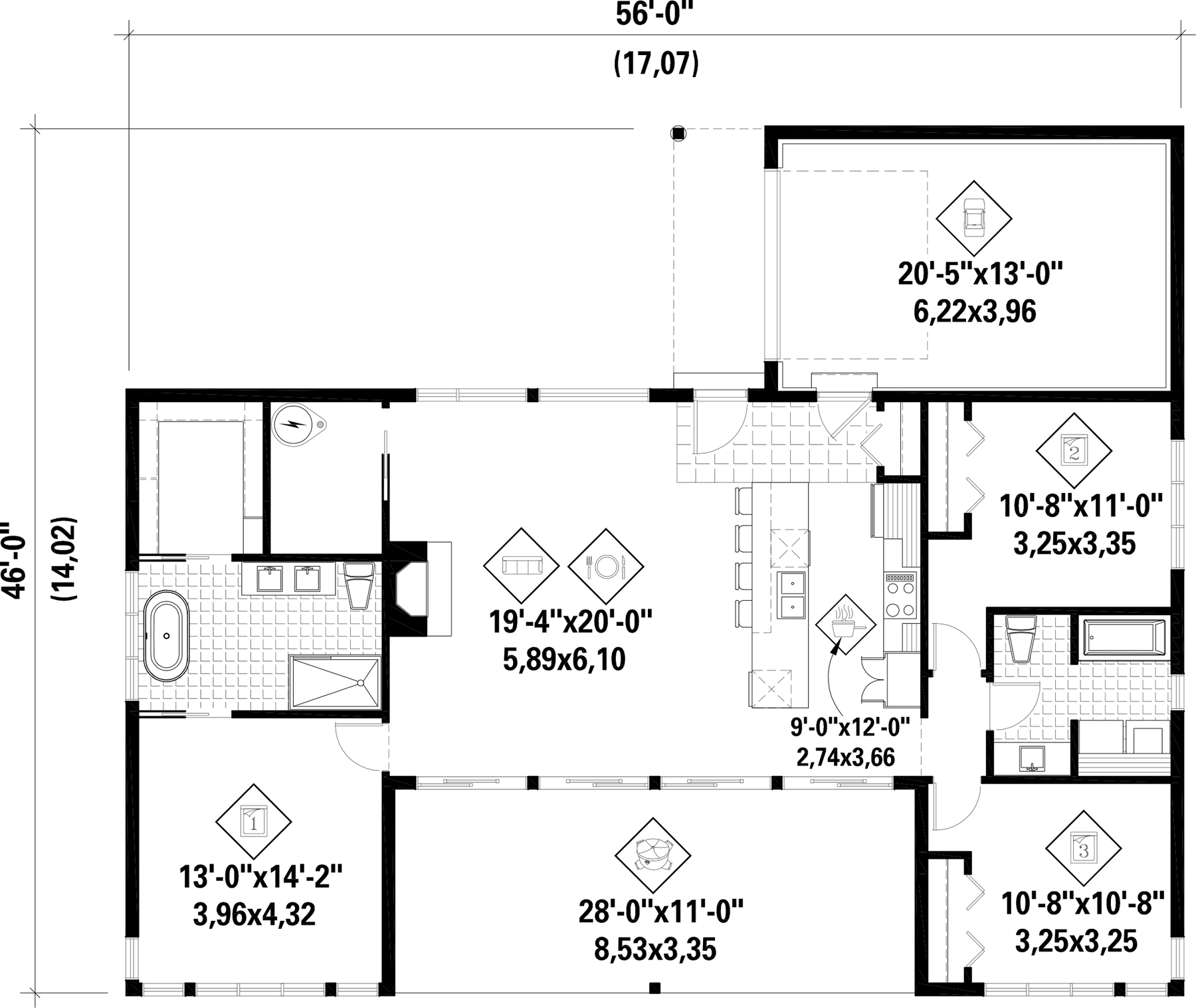 A large cottage, 56 feet wide by 46 feet deep, with many windows and a garage for one car. The master bedroom is connected to a private bathroom and a walk-in closet. The other two bedrooms share another bathroom. The kitchen, the dining room and the living room are all open-concept with a cathedral ceiling, the latter also has a fireplace.