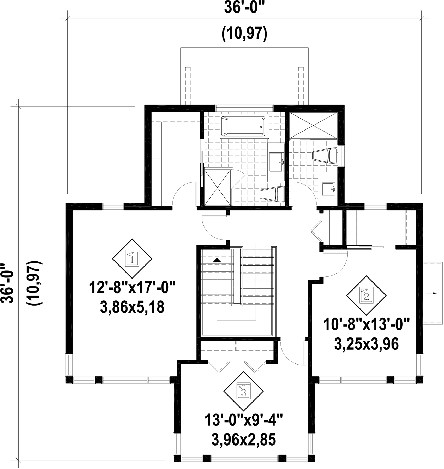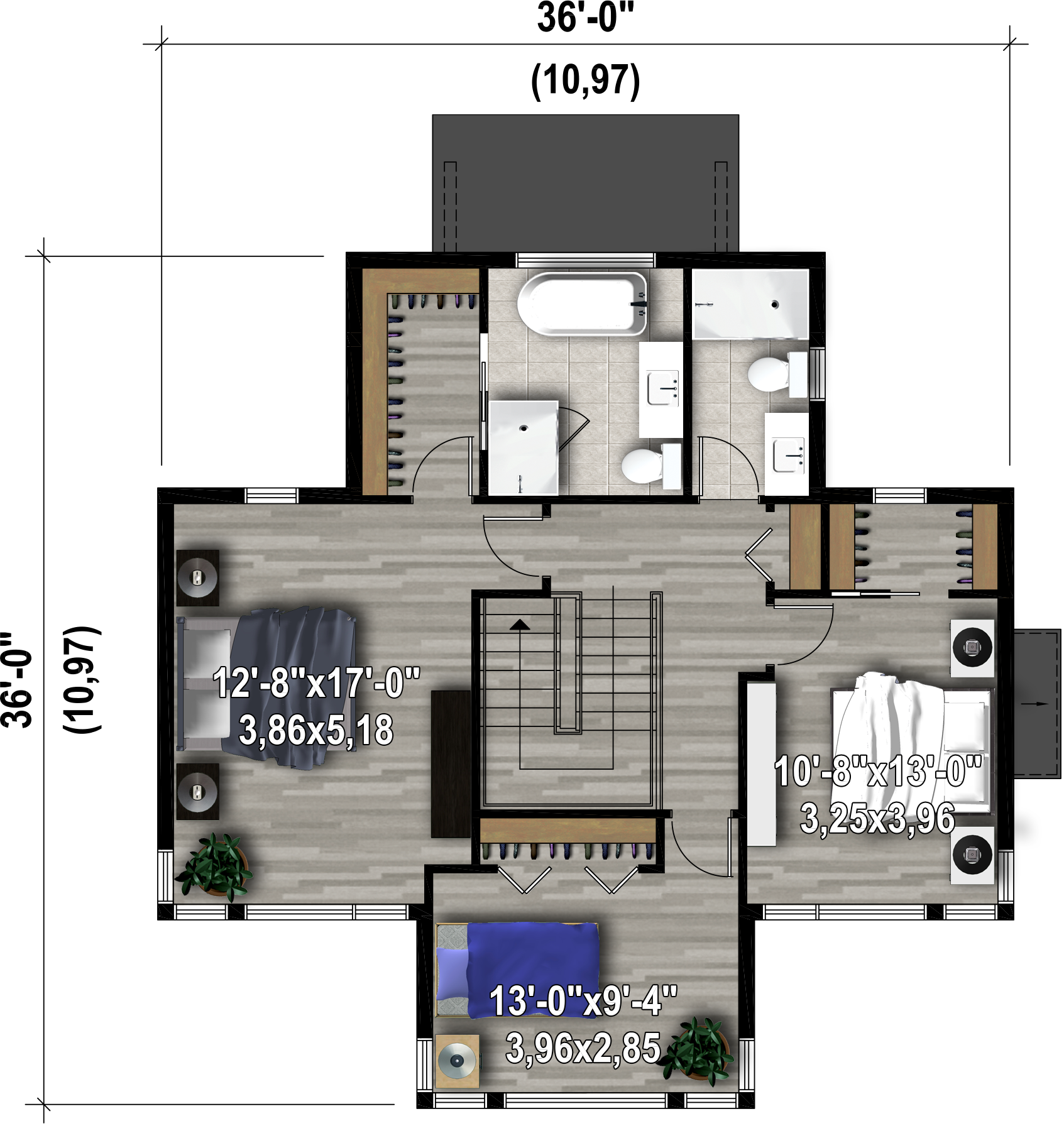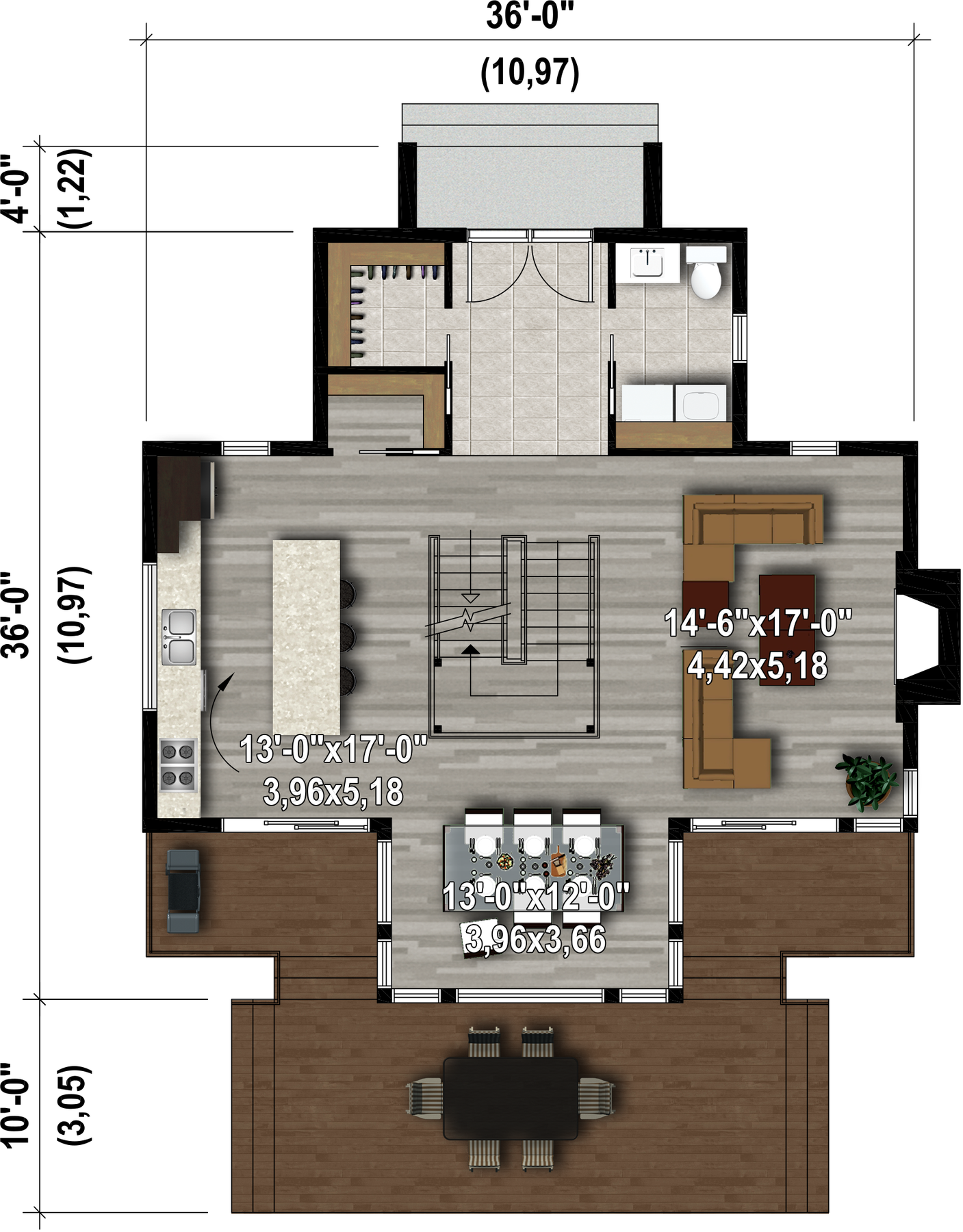 This wooden cottage will appeal to nature lovers with its imposing windows. It is 36 feet wide by 36 feet deep and provides 1,920 square feet of living space.
