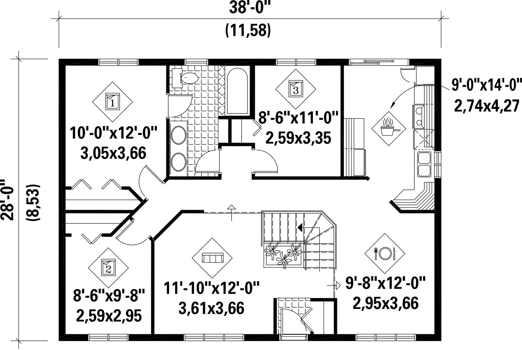 | Front | 38 ft | Total living surface | 1064 ft² |