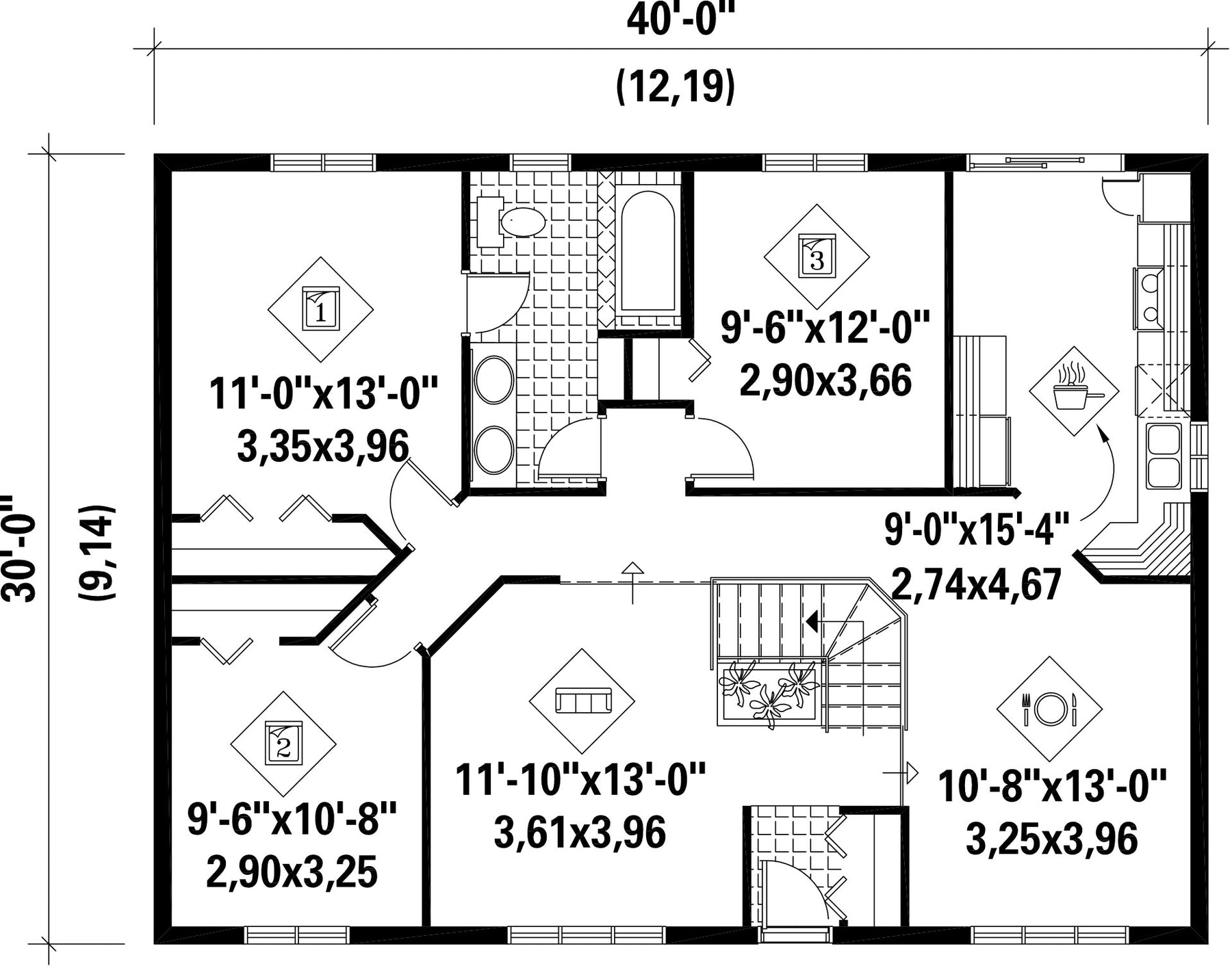 | Front | 40 ft | Total living surface | 1200 ft² |