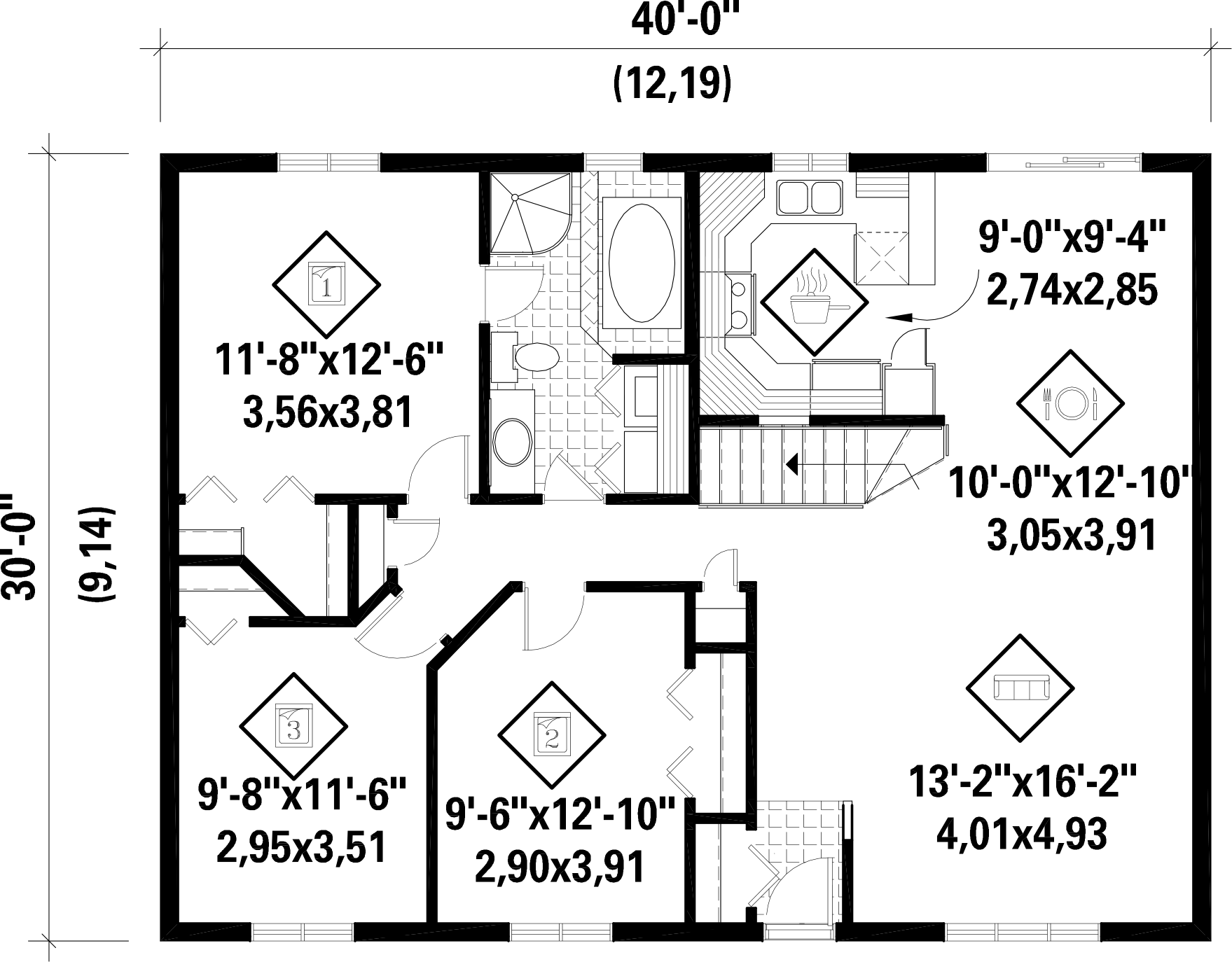 | Front | 40 ft | Total living surface | 1200 ft² |