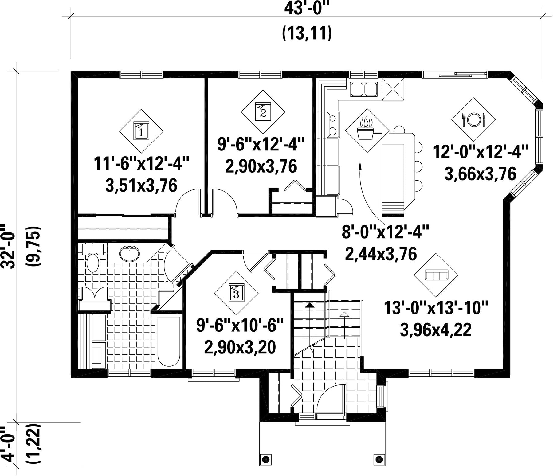 | Front | 43 ft | Total living surface | 1193 ft² |