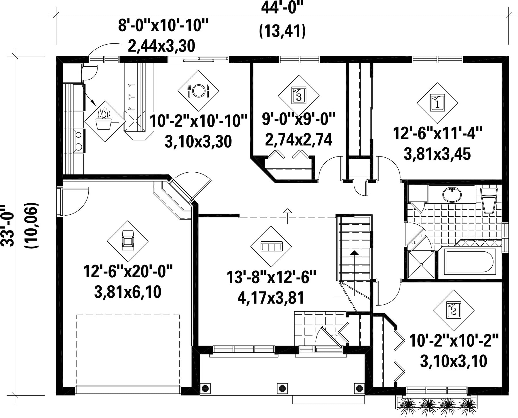 | Front | 44 ft | Total living surface | 1113 ft² |