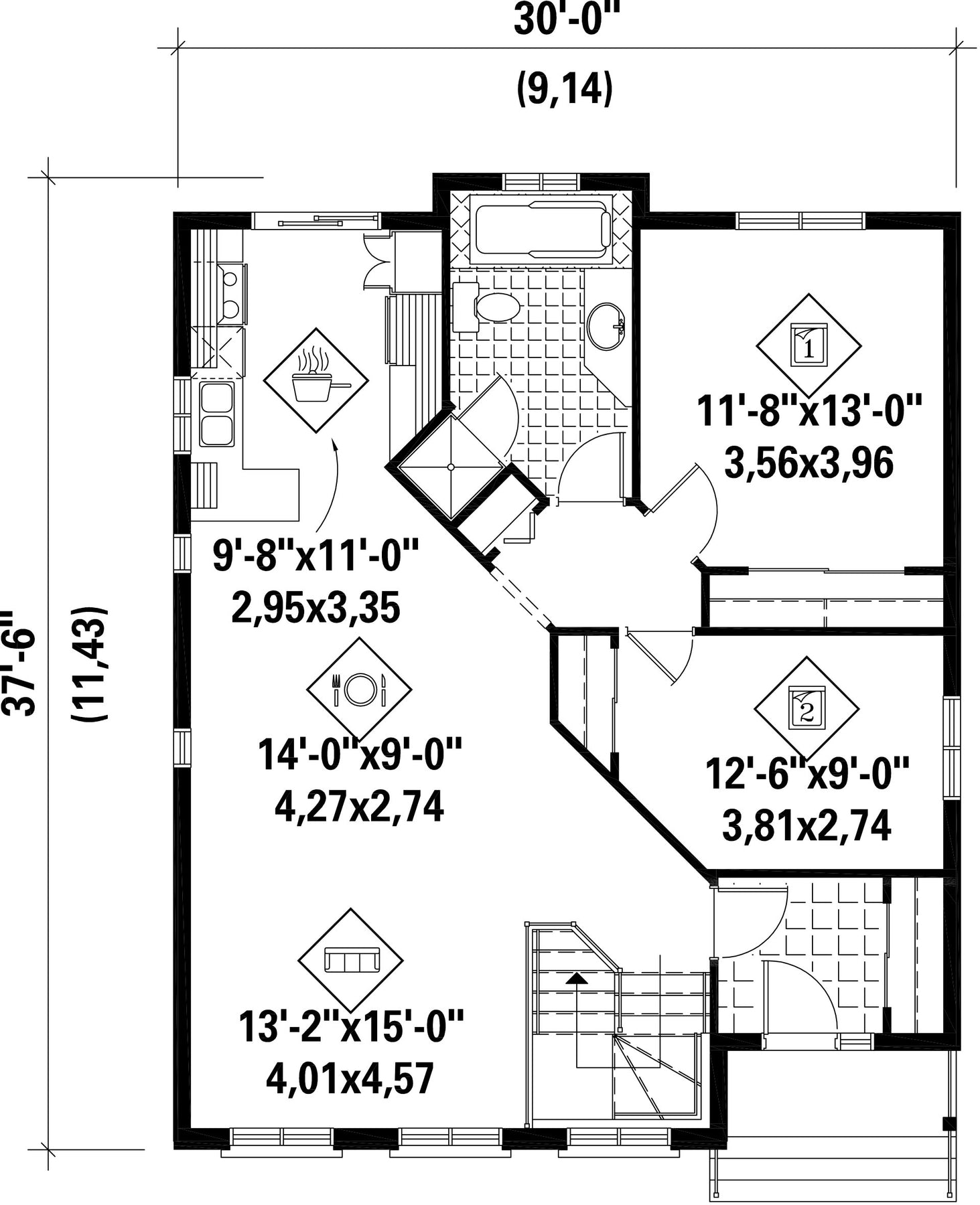 | Front | 30 ft | Total living surface | 1056 ft² |