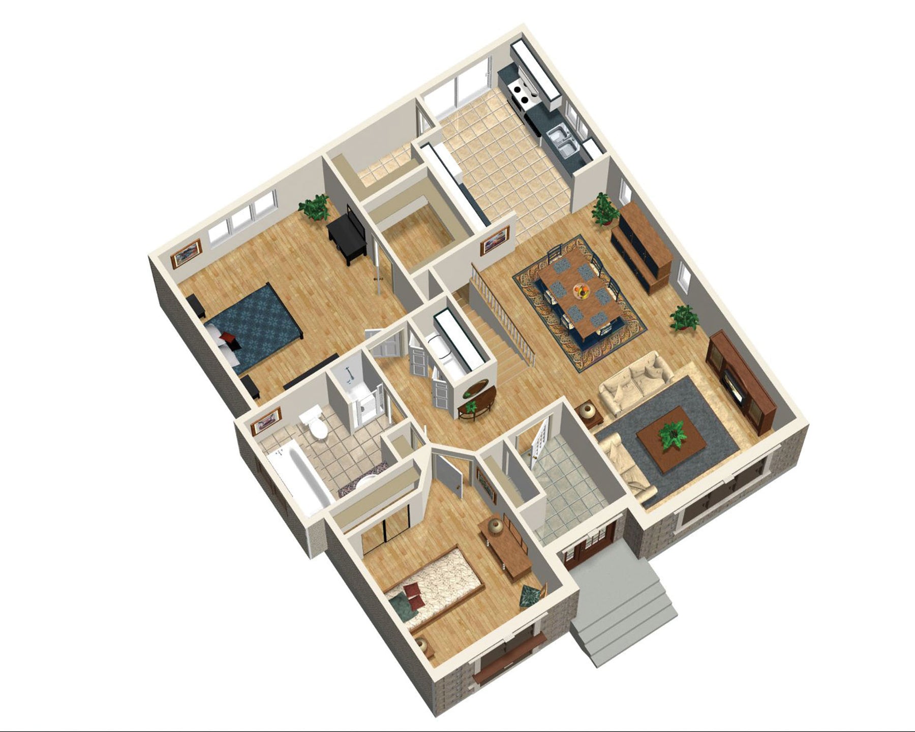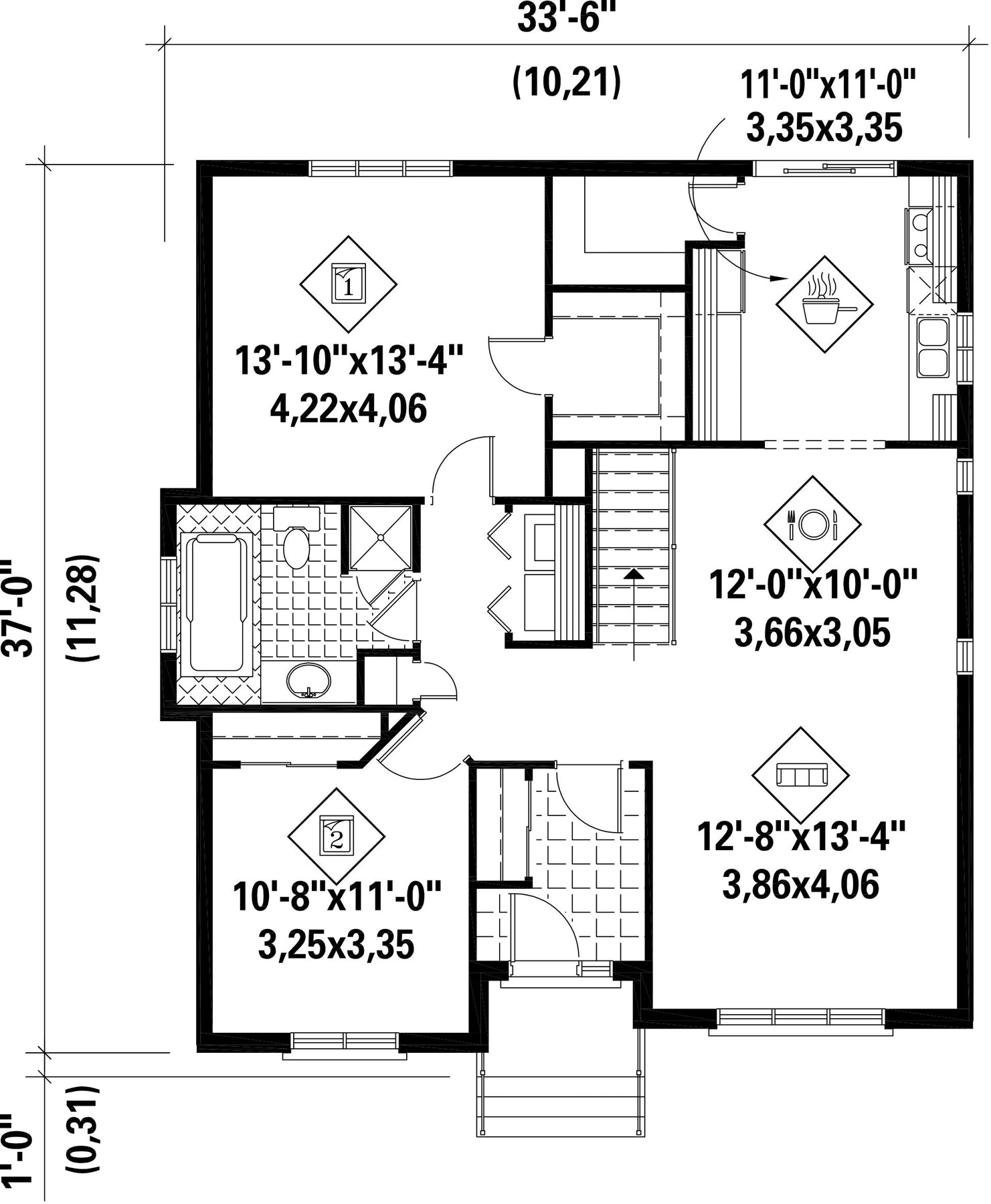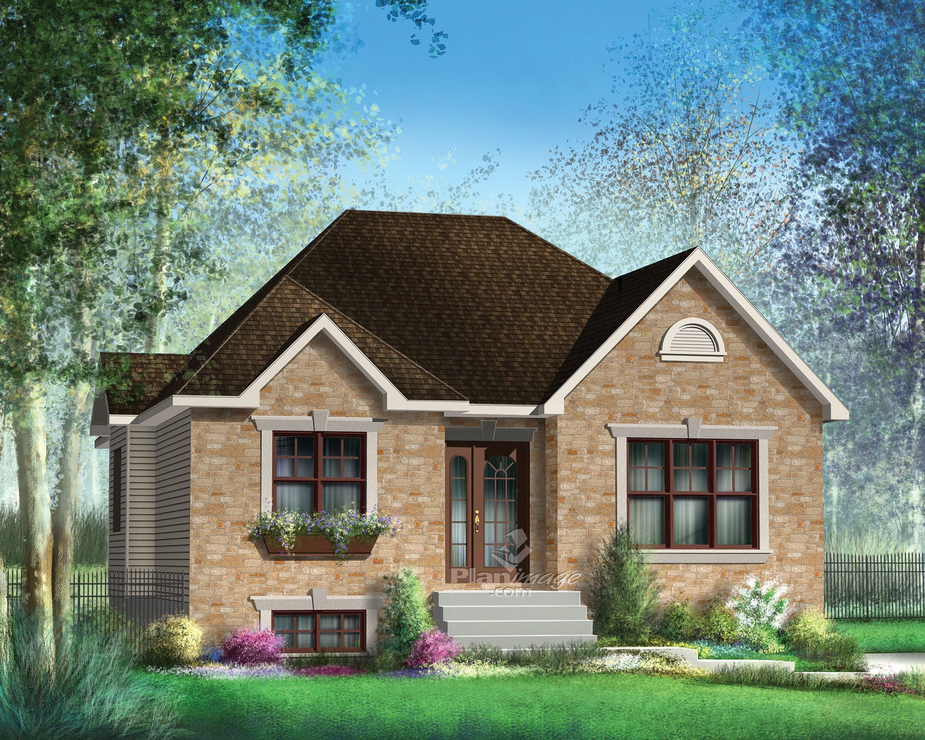 Thanks to the architectural details and stone facing, this lovely bungalow has an elegant look. The house is 33 feet 6 inches wide by 37 feet deep and provides 1,166 square feet of living space.