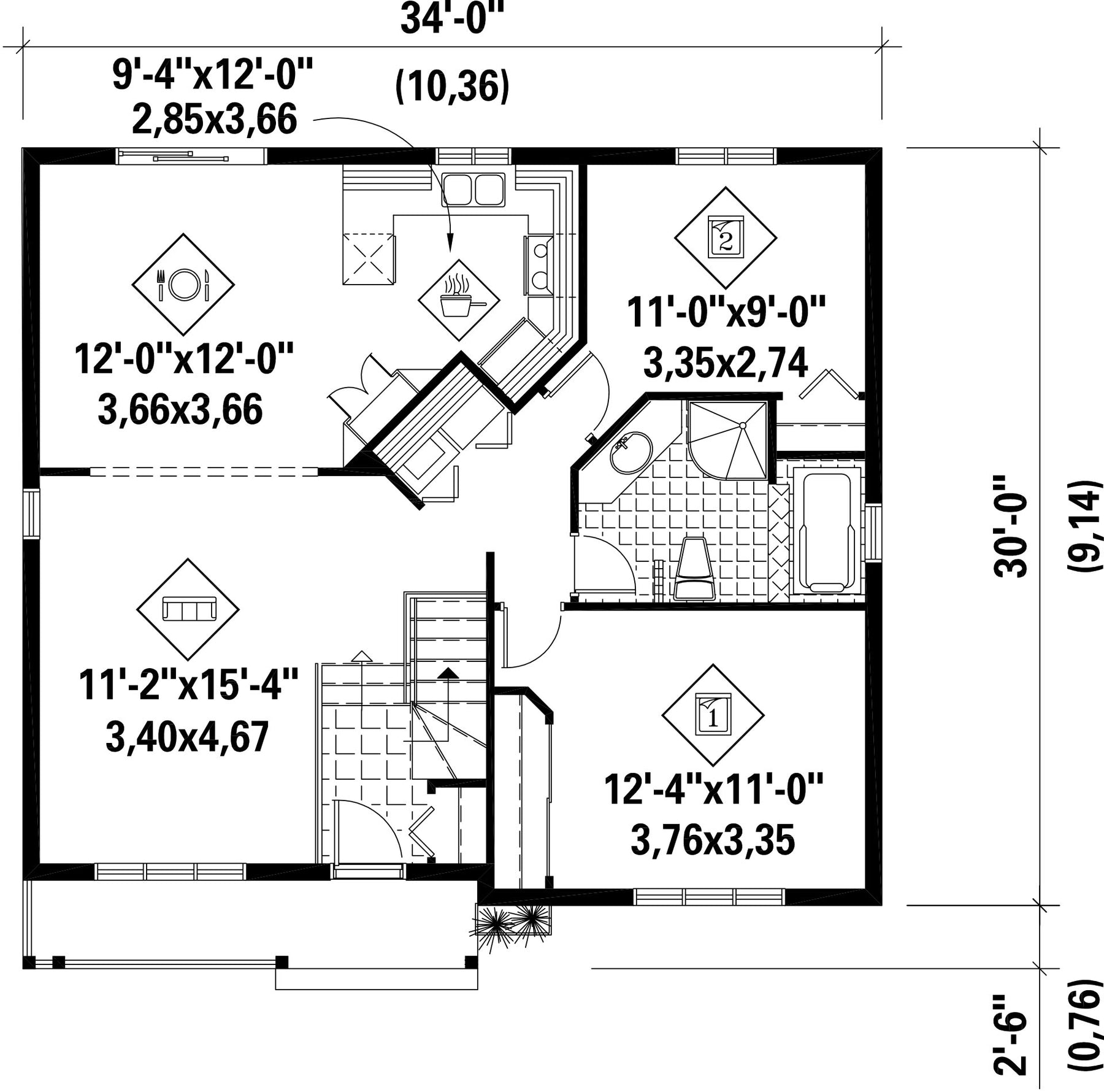 With its roof gables, small veranda and large windows, this bungalow is warm and inviting. The house is 34 feet wide by 30 feet deep and provides 1,002 square feet of living space.