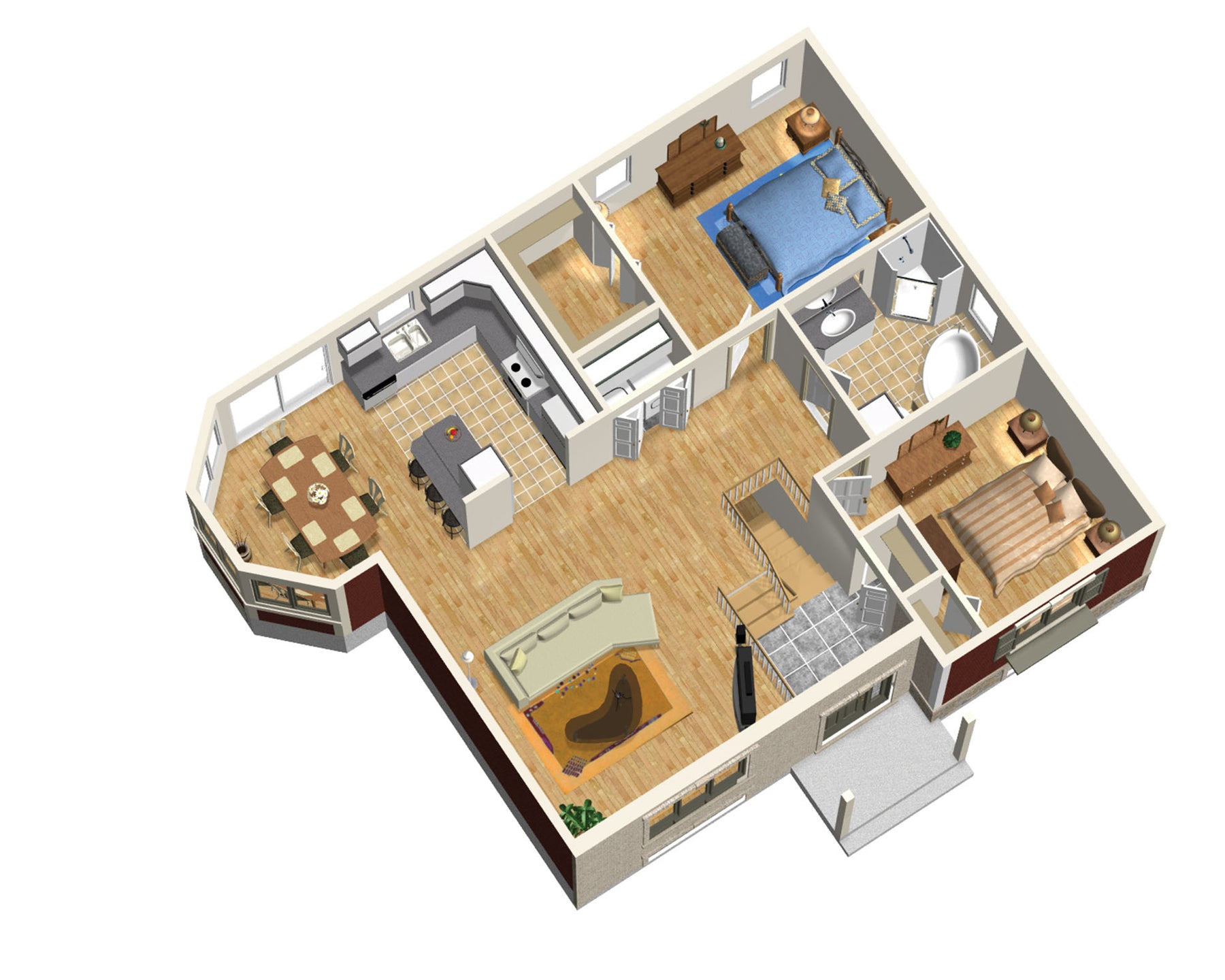 The home consists of a split-level entrance, a large living room, a kitchen with an island and a lunch counter, an open dining room, a bathroom, and two bedrooms, including a master bedroom with a large walk-in closet.
