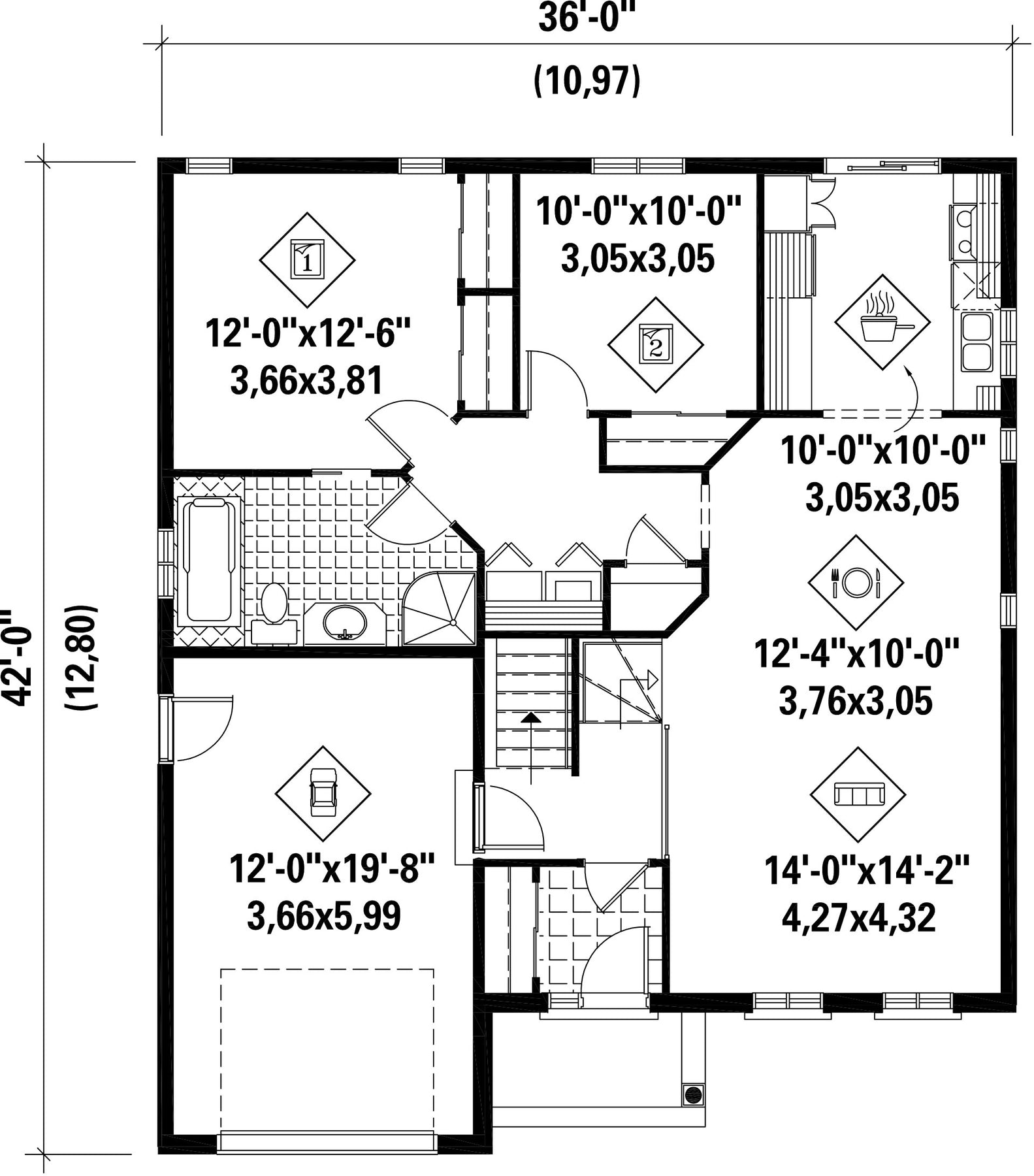 The front porch with decorative columns and the various architectural details give an elegant look to this stone and brick bungalow. The house is 36 feet wide by 42 feet deep and provides 1,099 square feet of living space. It also includes a 281 square foot one-car garage.