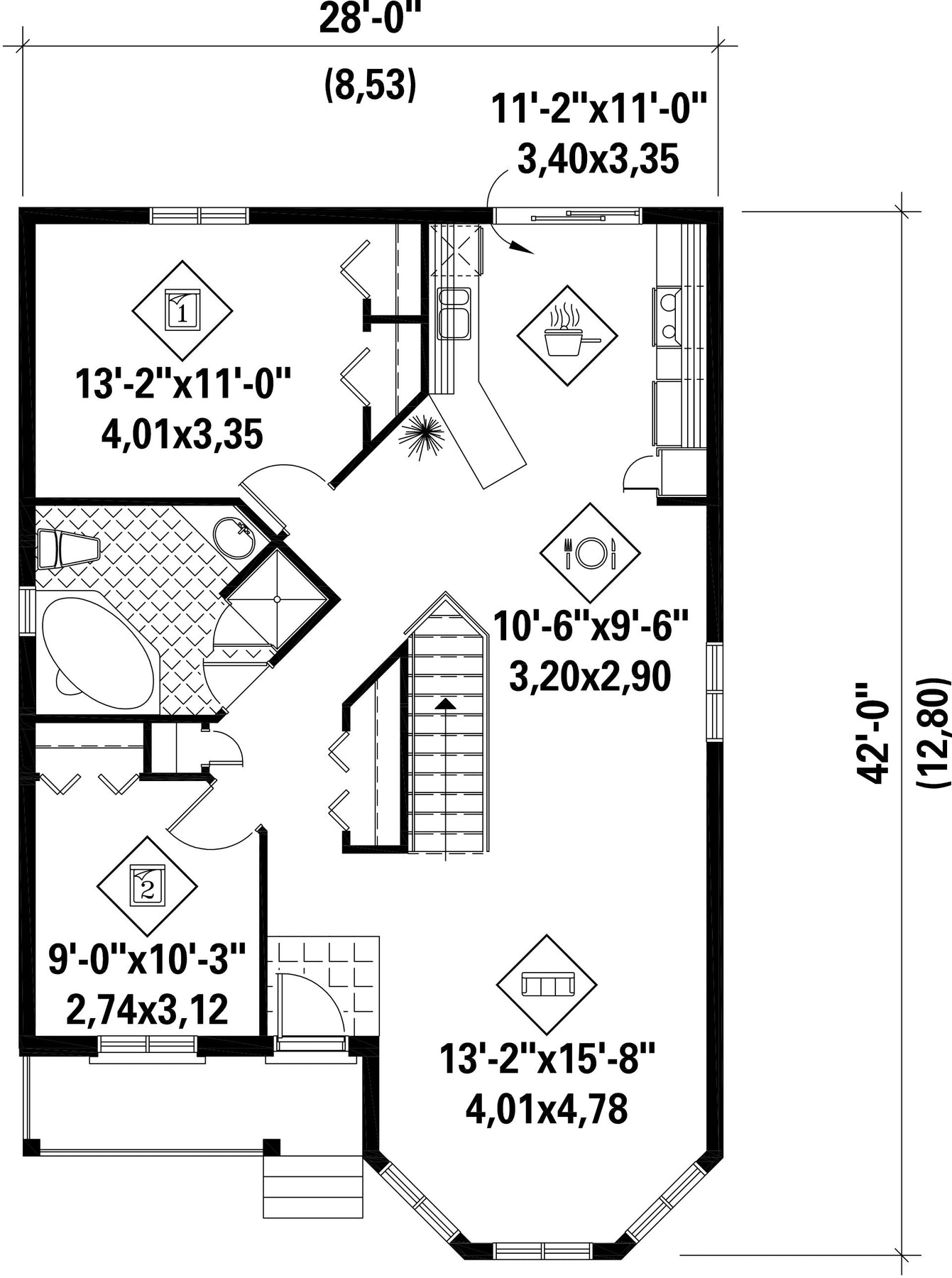 | Front | 28 ft | Total living surface | 1050 ft² |