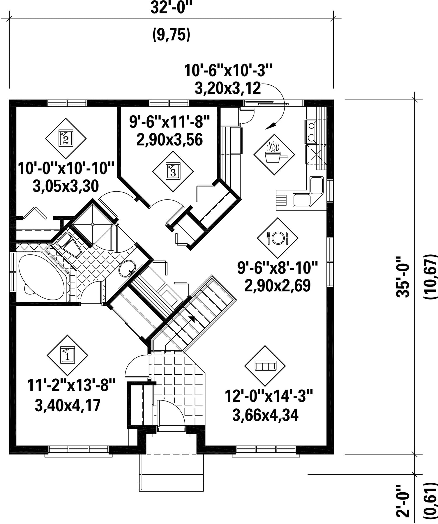 | Front | 32 ft | Total living surface | 1110 ft² |