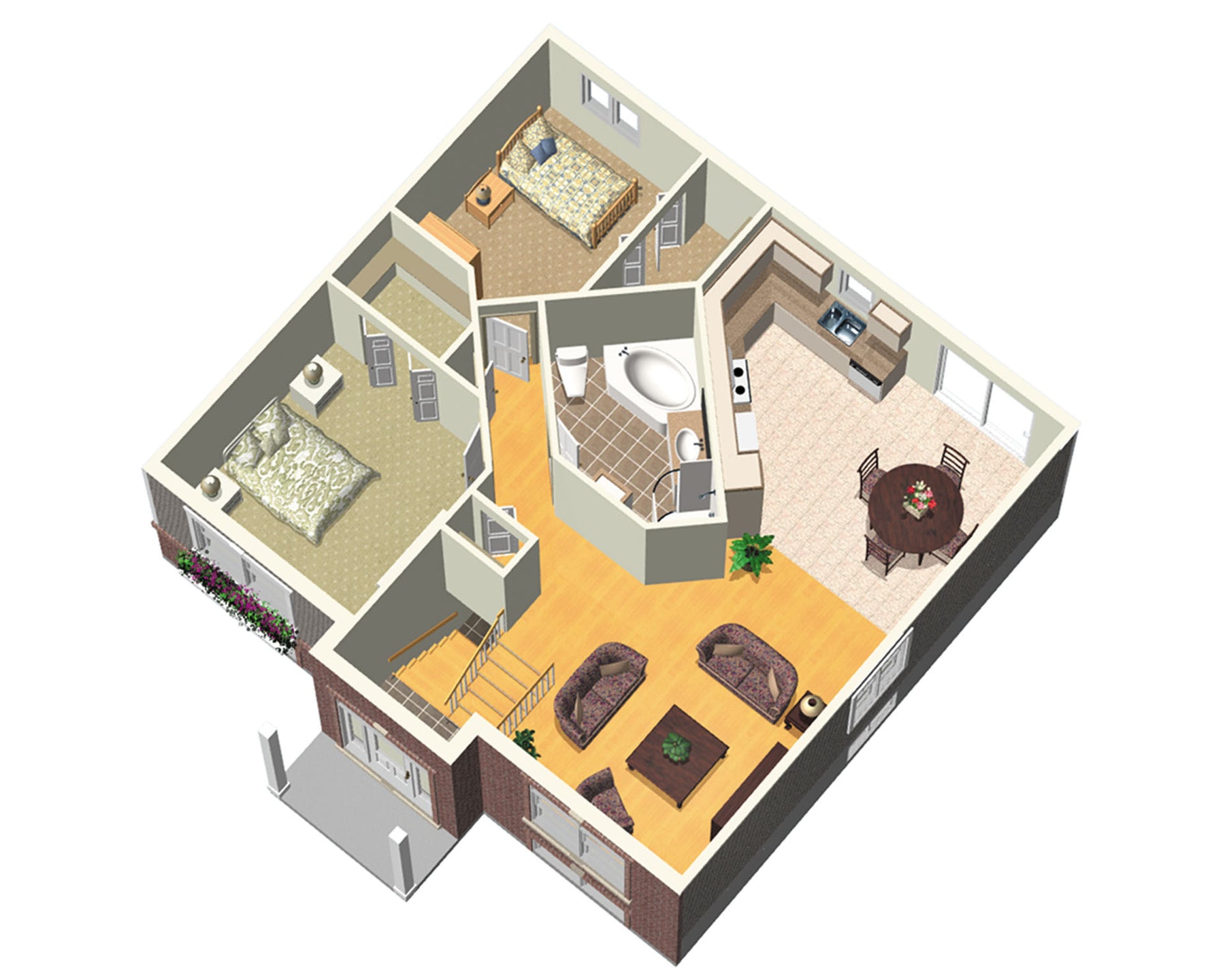 Thanks to roof gables, a porch with decorative posts and architectural details, this bungalow with a partial brick facing has an undeniably elegant style. The house is 34 feet wide by 33 feet deep and provides 1,072 square feet of living space.