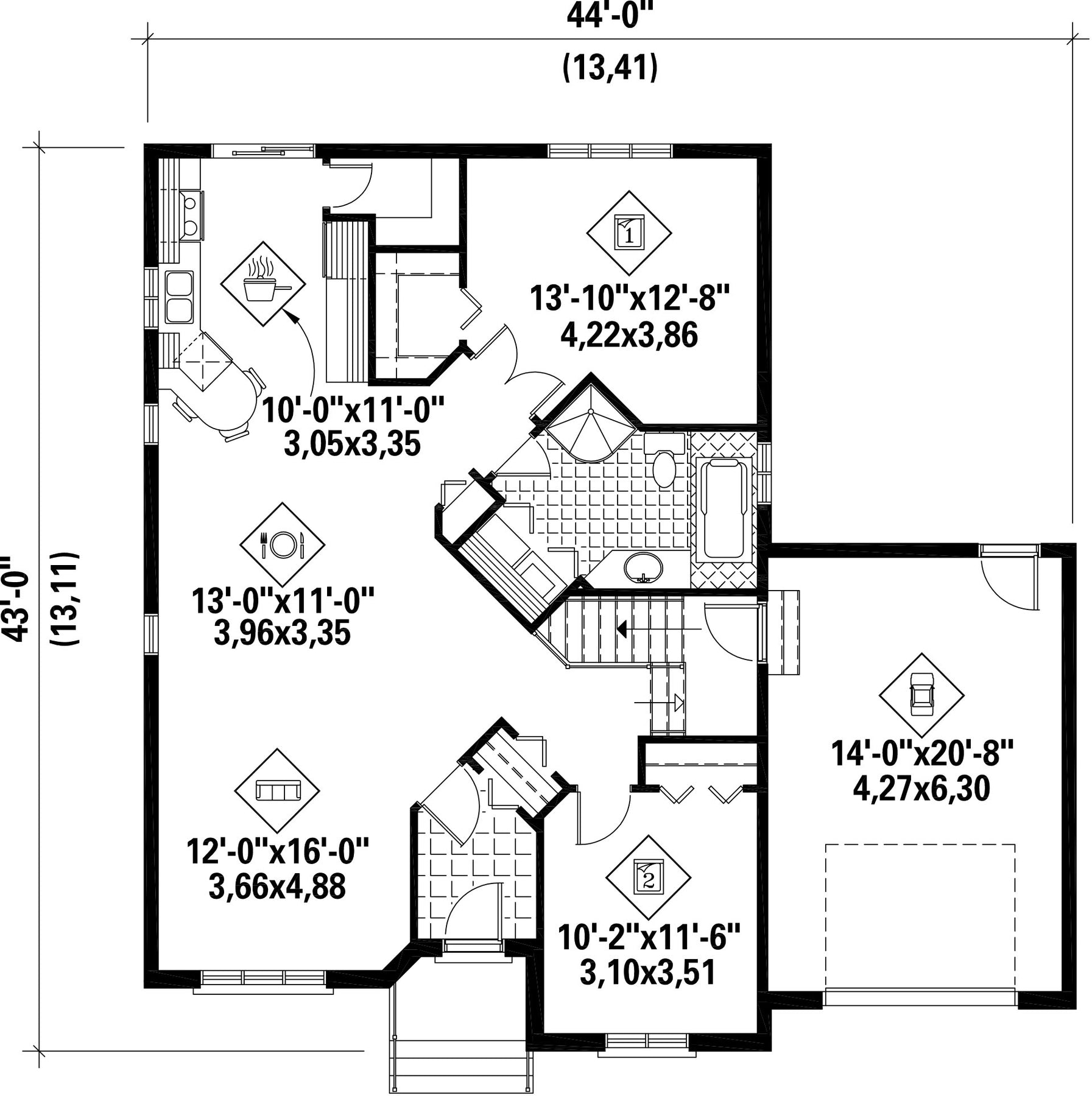 The symmetrical gables, the brick facing and the shutters of this lovely bungalow give it an elegant and inviting look. The house is 44 feet wide by 43 feet deep and has a 1,206 square foot living area.